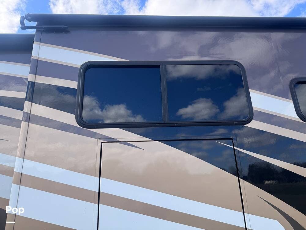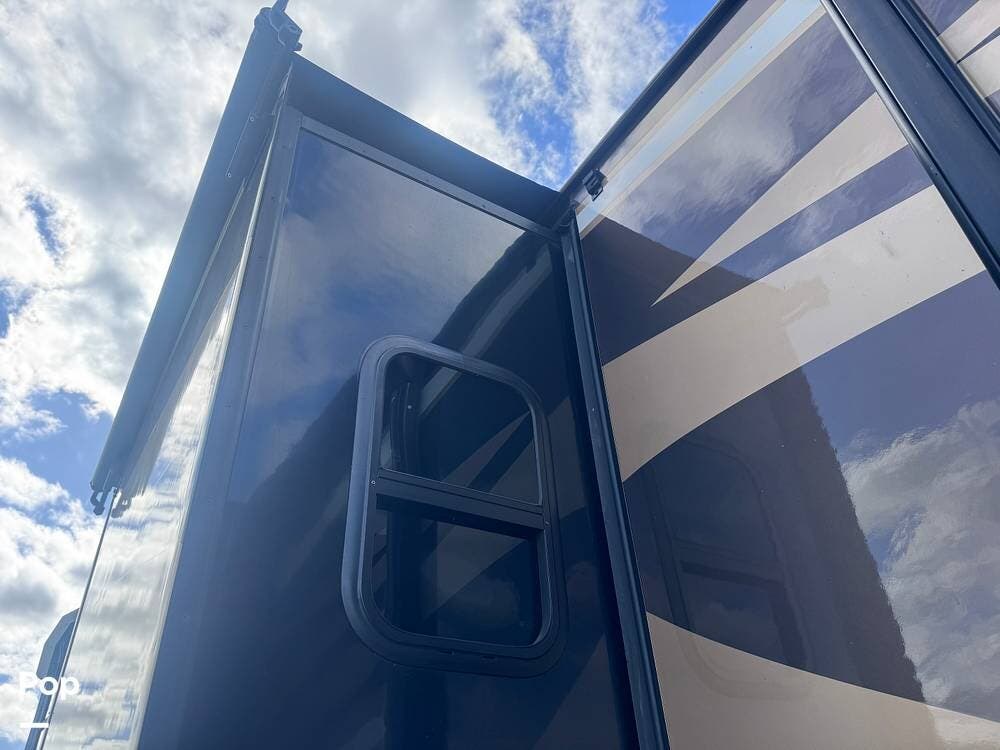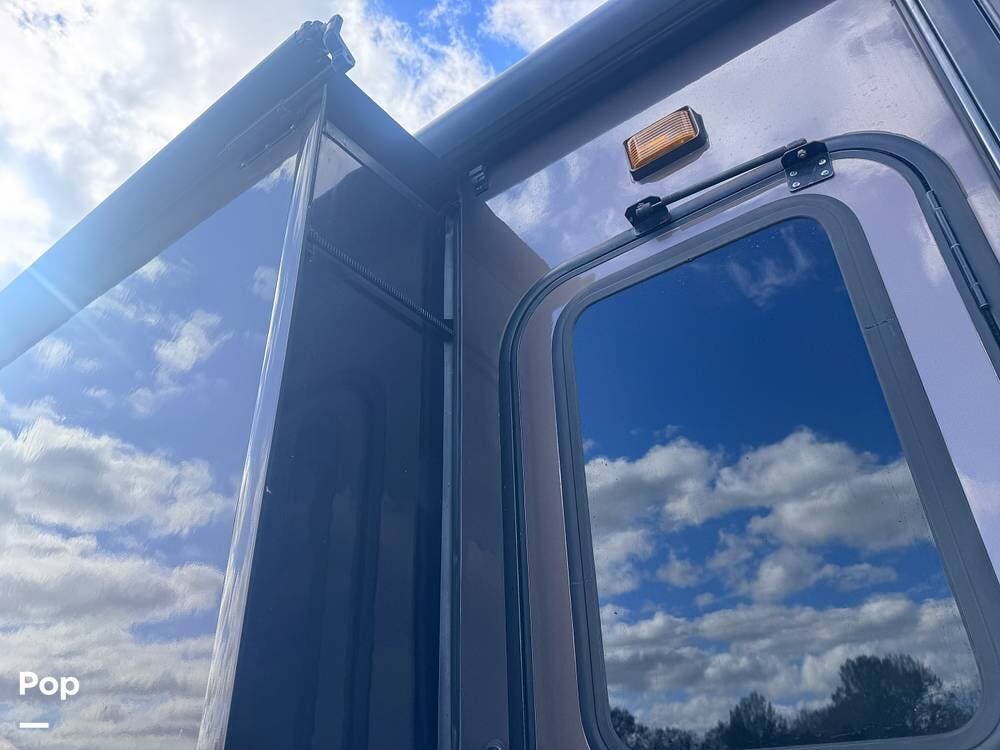 The exterior features full-body paint, a one-piece panoramic windshield, seamless sidewall transitions, 22.5-inch aluminum wheels, and side-swing luggage doors that provide easy access to generous pass-through basement storage. Dual-pane windows, sideview cameras, and 4-point automatic hydraulic leveling jacks further enhance convenience and drivability.