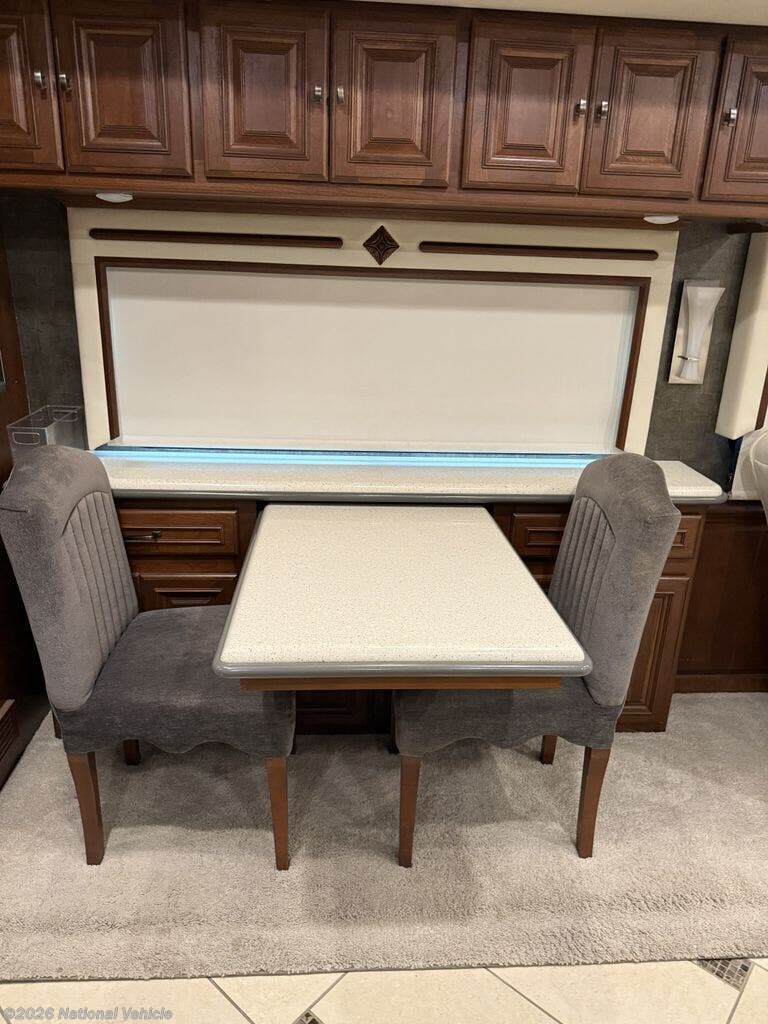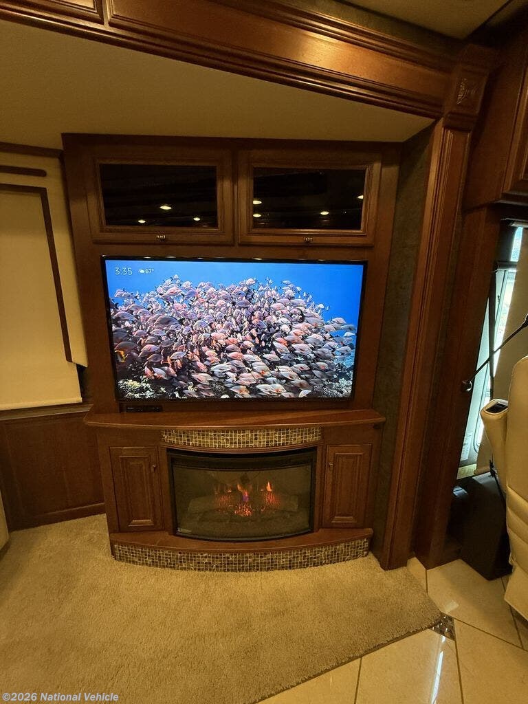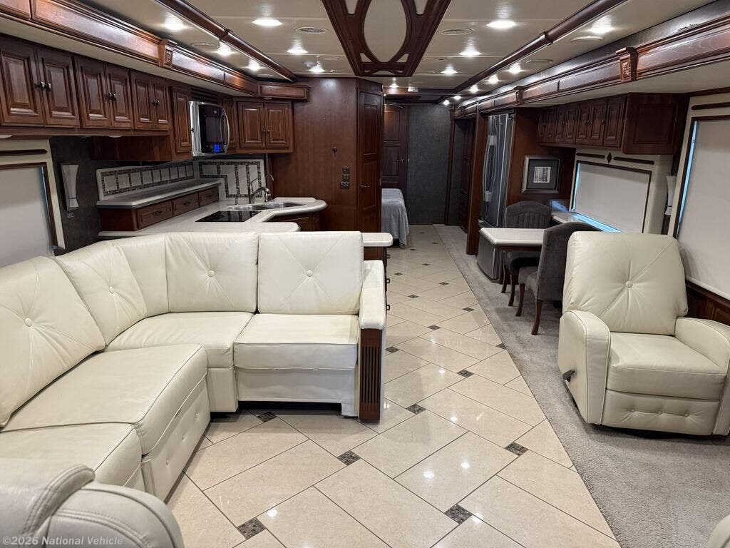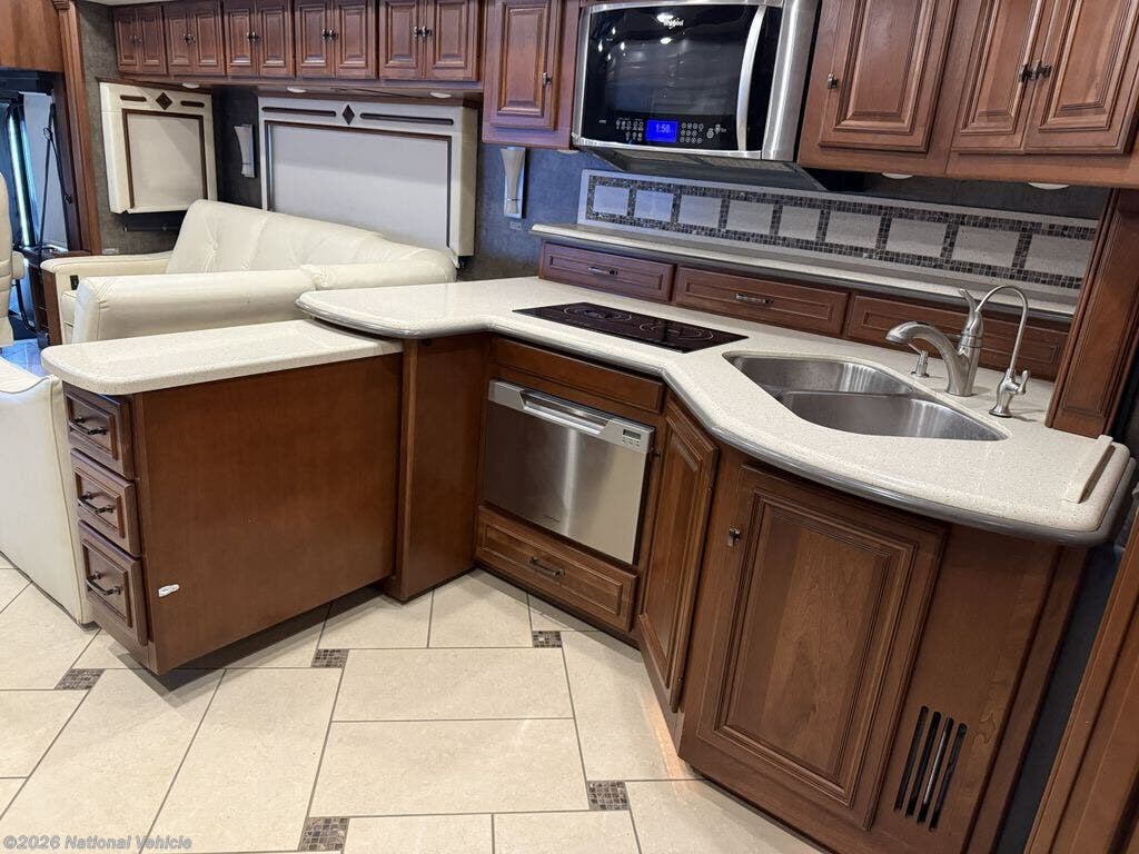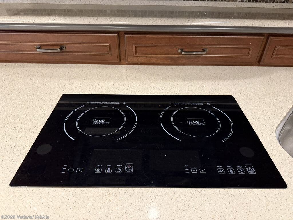 Inside, the 42DQ floorplan is designed for both relaxation and functionality. Quad slide-outs open up the living space, creating a residential feel with premium furnishings, polished tile flooring, and solid-surface countertops. The main living area features plush seating, a large flat-screen TV, and an electric fireplace?perfect for unwinding after a day on the road. The kitchen is fully equipped with a residential refrigerator, induction cooktop, convection microwave, and ample cabinetry, making meal prep effortless.