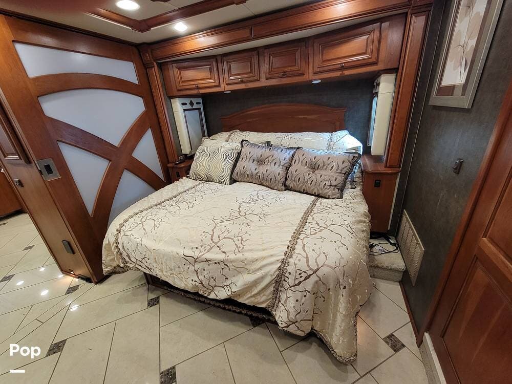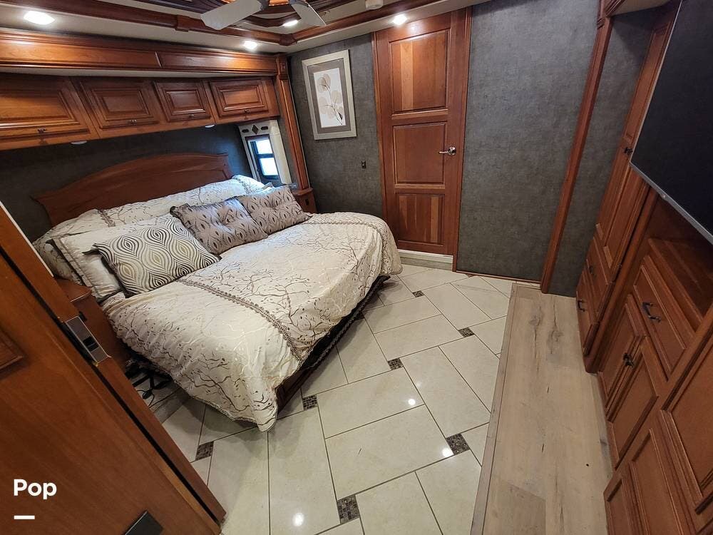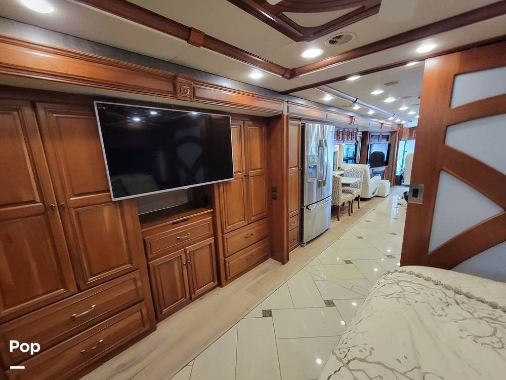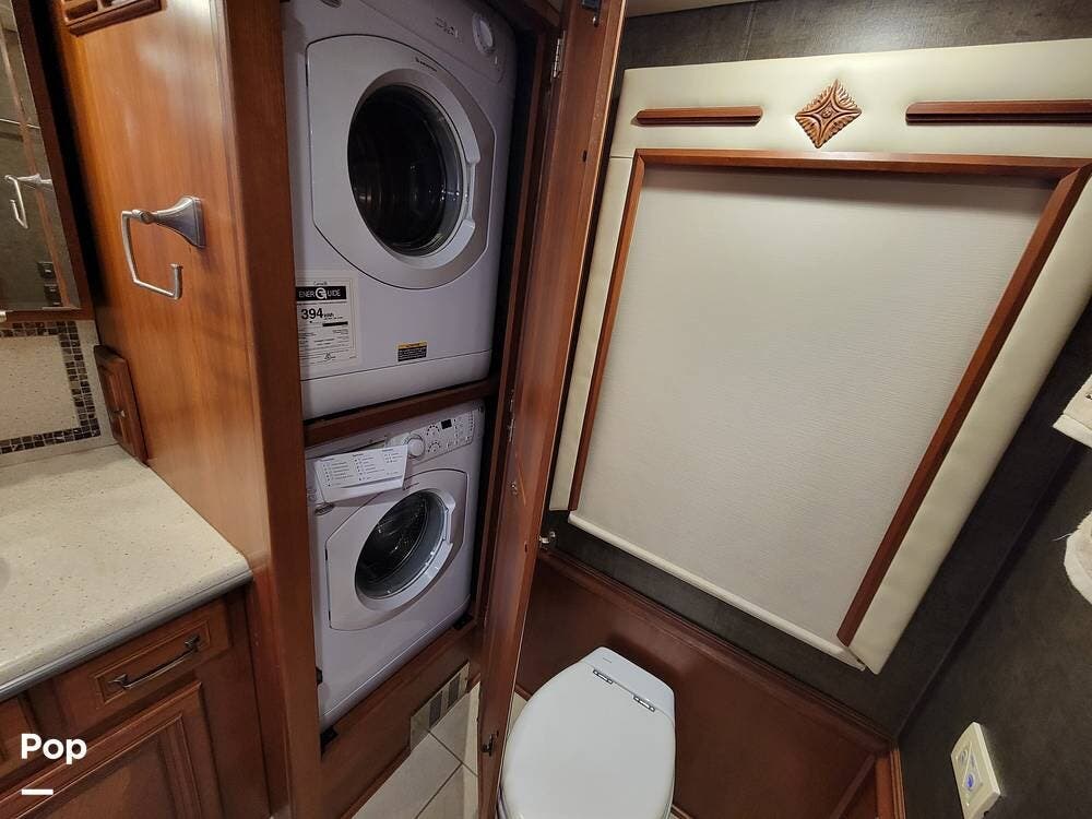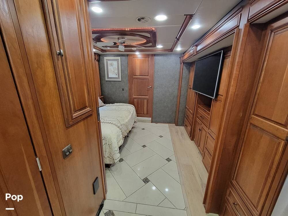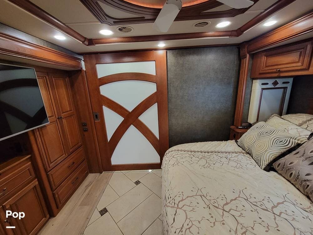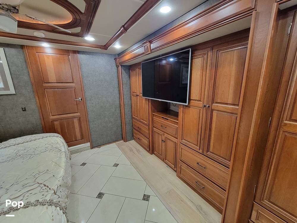 The bedroom has an oversized TV mounted there. The rear of the coach has a large bathroom with a washer-dryer.