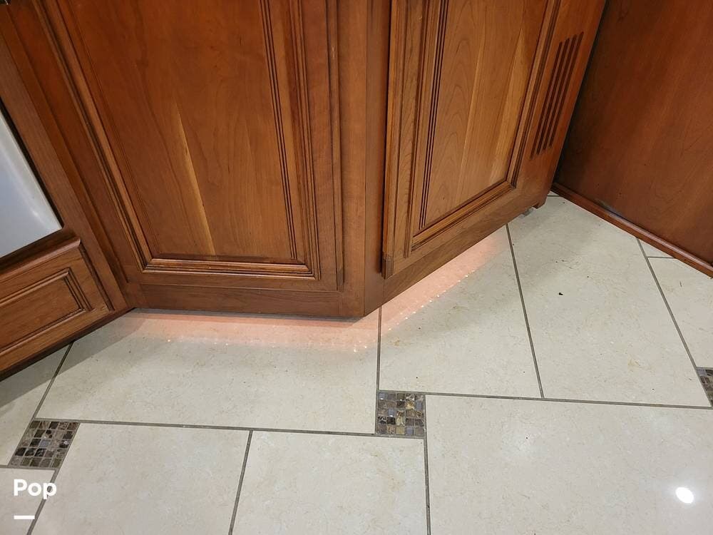 The classy bone-white furniture provides a luxurious look. The glossy heated tile floors look stunning. The large slide-out has easy-to-maintain flooring.