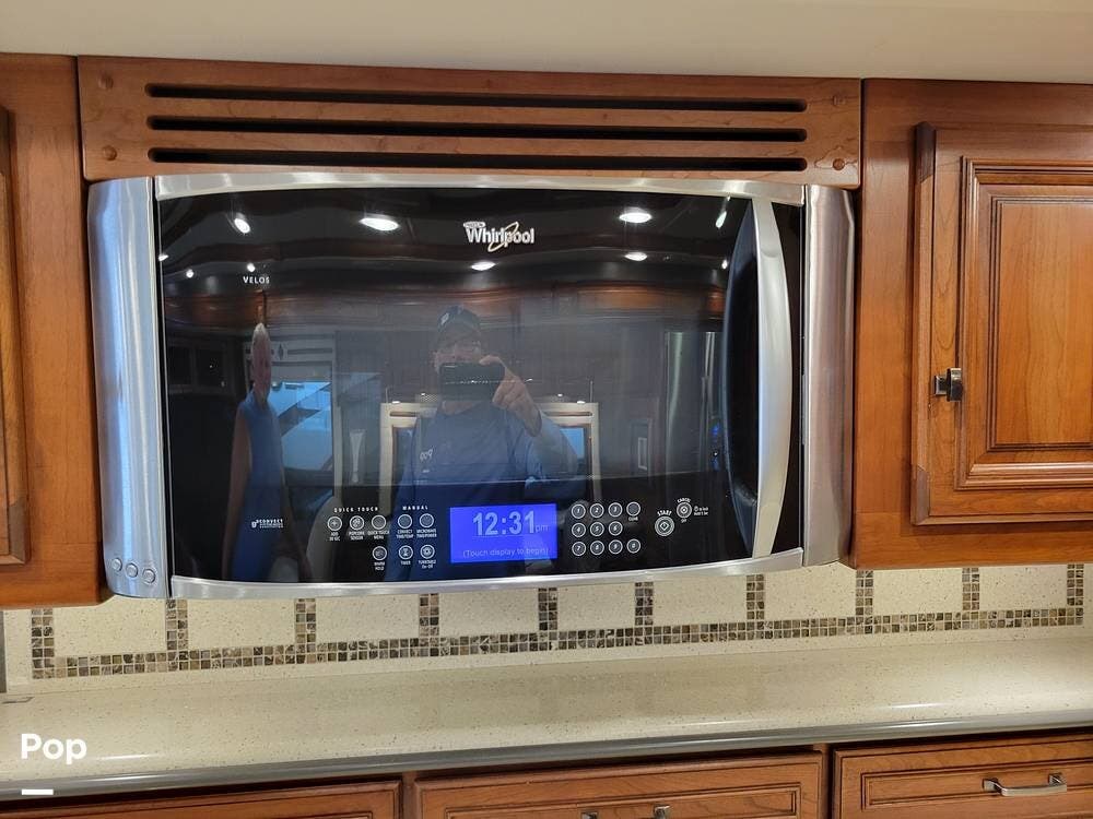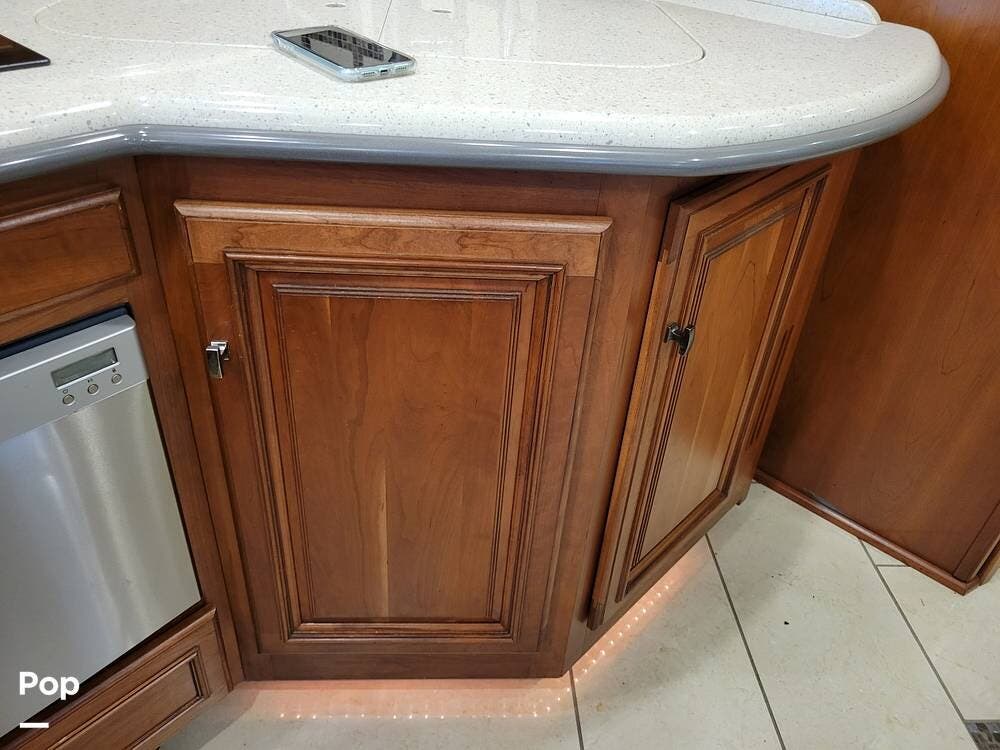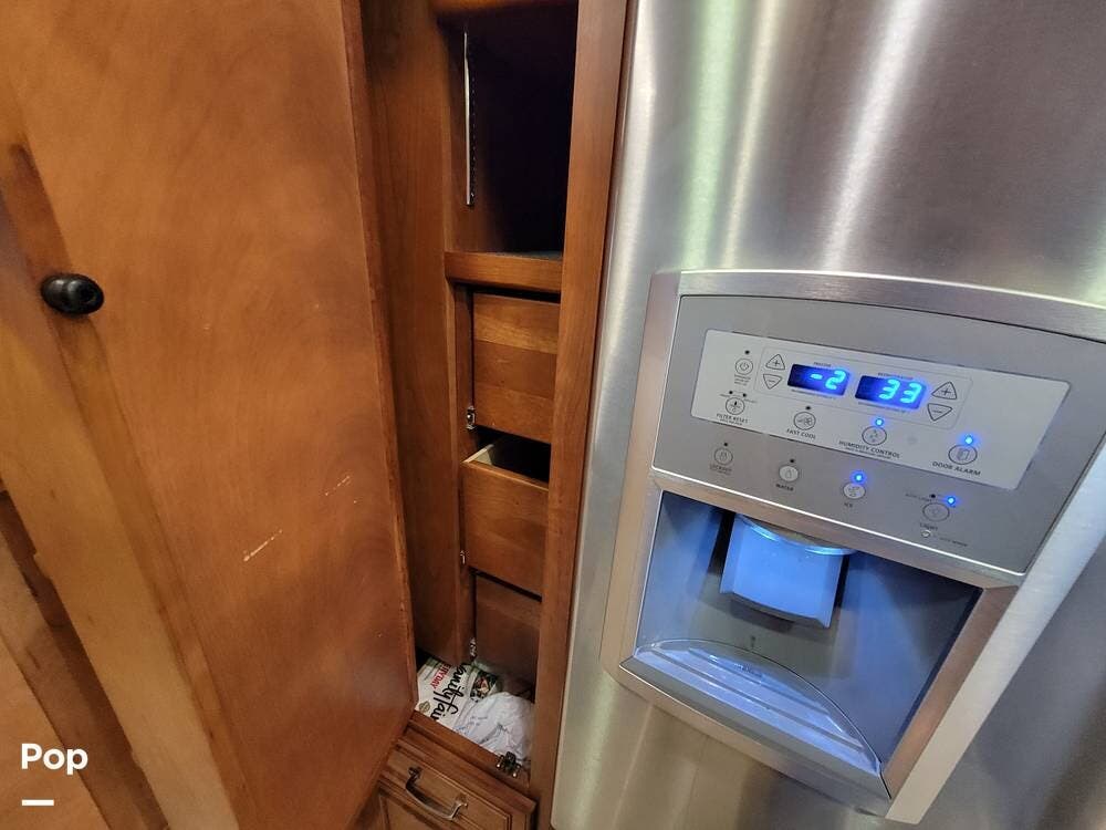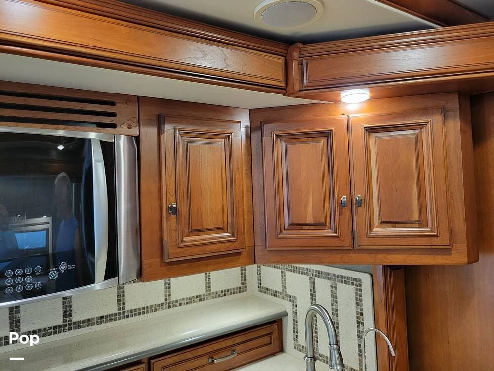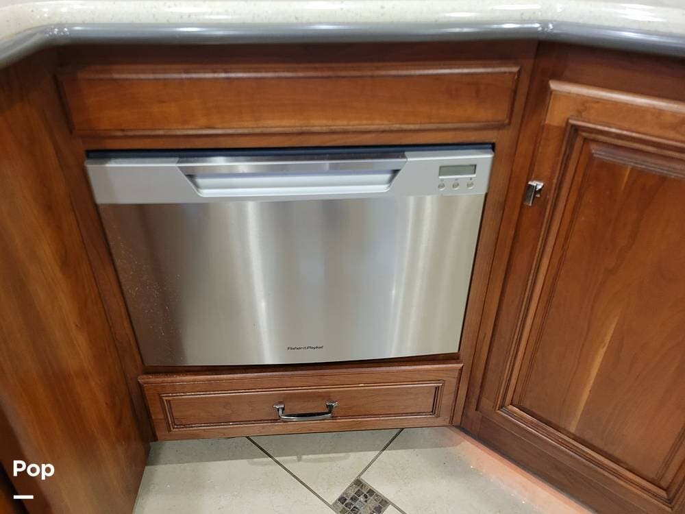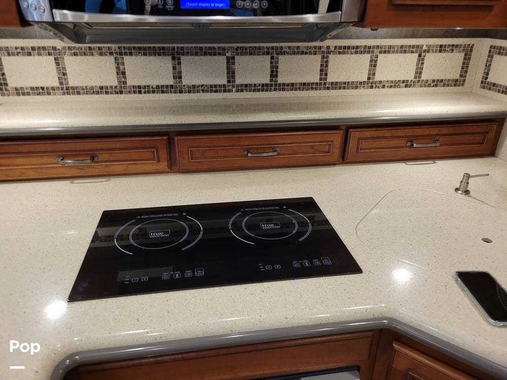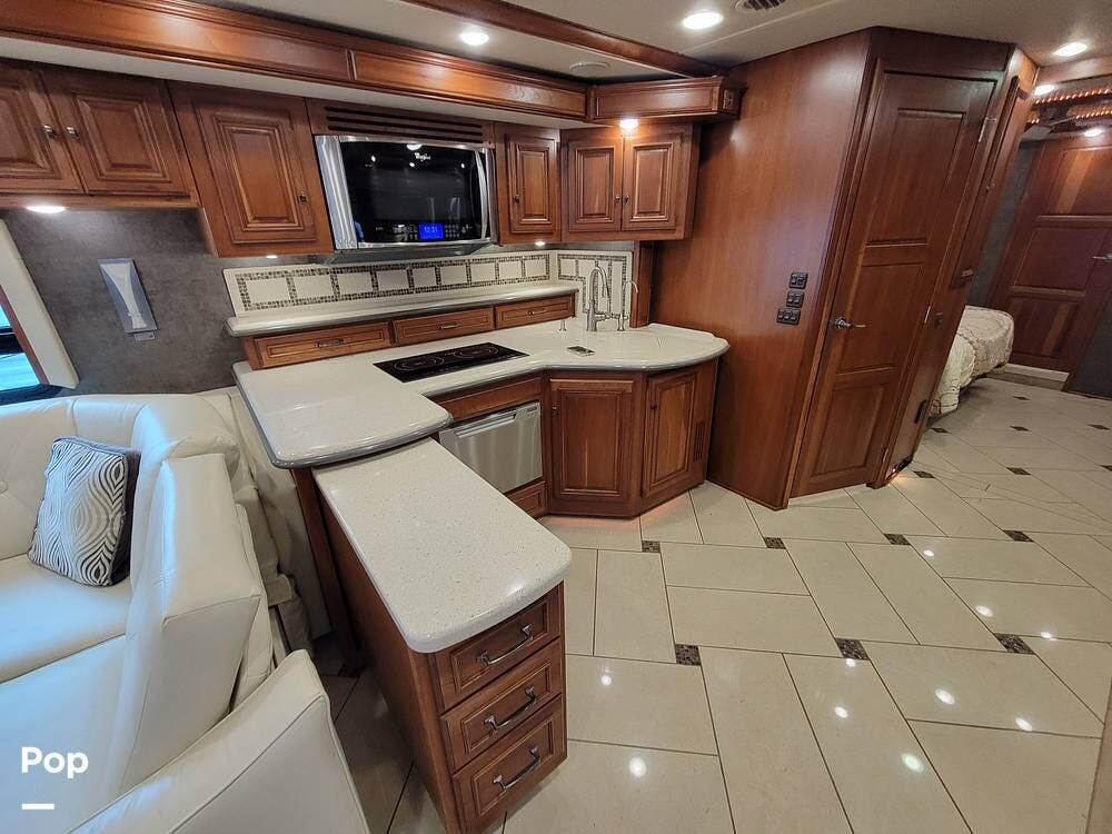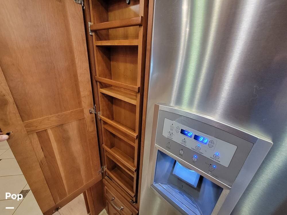 The kitchen is well equipped with an extendable countertop, double sink, generous counter space, solid wood cabinets, cooktop, convection microwave, and dishwasher. There is also a full-size refrigerator with a slide-out pantry.
