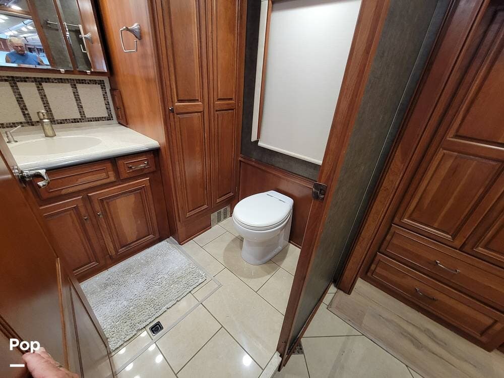 This coach has a half bath for convenience. The bedroom has a privacy slide and a queen-size bed. The solid wood cabinets have plenty of storage space.