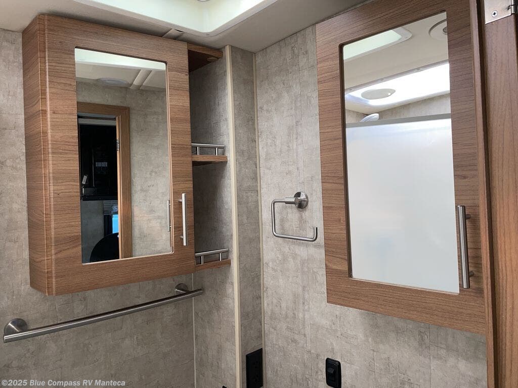Beyond the sofa heading toward the rear of the coach you will find a side bath with corner shower, toilet, and vanity with round sink including a medicine cabinet. A nice size wardrobe is found across from the bath before the rear bedroom area.