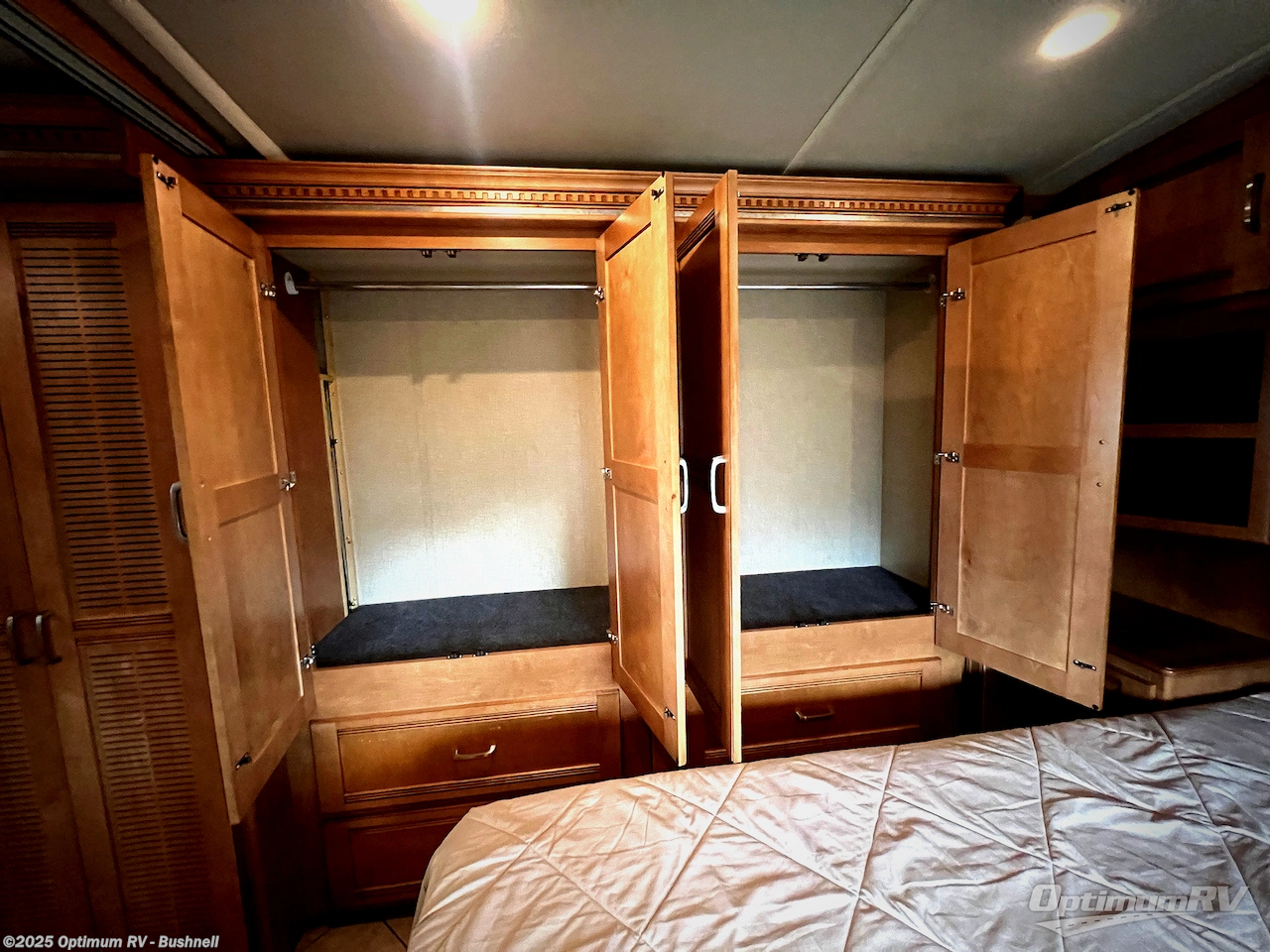 Moving beyond the bath you will find the rear master bedroom with a sliding door. There is a 32" HDTV on the wall to the right as you enter. Enjoy sleeping on a queen size bed with dual nightstands, overhead storage, and there is also plenty of storage for clothing and things in the large wardrobe which is part of the curb side full wall slide, plus so much more!