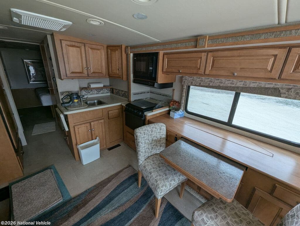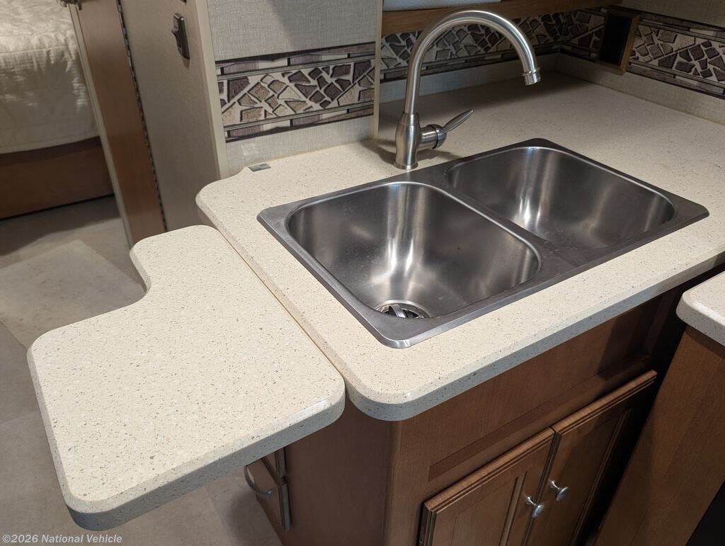 The kitchen is well-equipped for cooking on the road, featuring Corian countertops, a gas cooktop stove, convection microwave oven, double sink, and a two-door gas/electric refrigerator. Storage is plentiful throughout the coach.