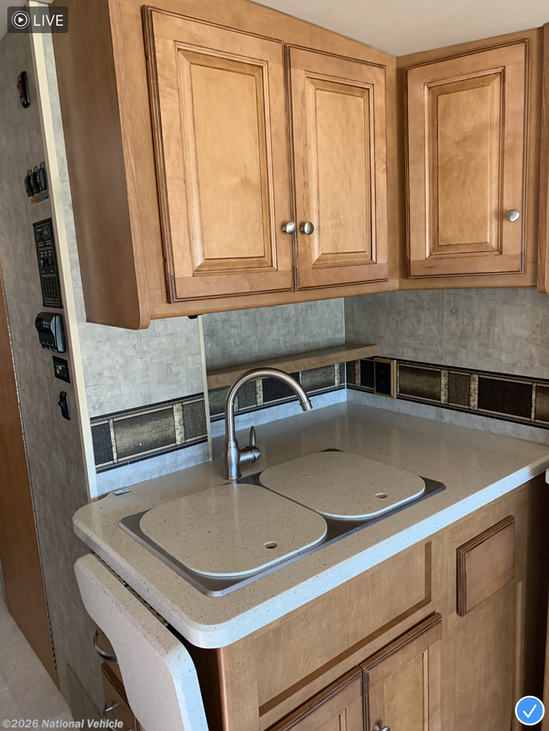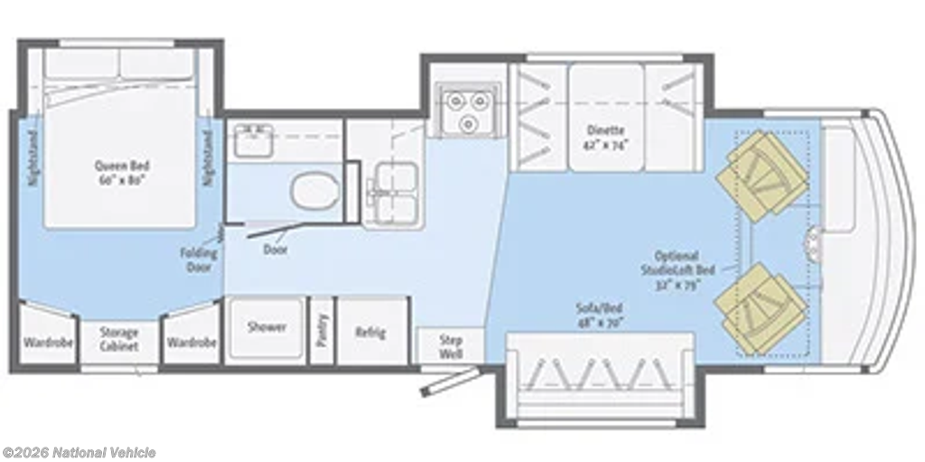 This class A coach features a wide open living area with dual opposing slides just behind the front cab seats that can swivel toward the rear for added seating. The slide to the right of the side entry door features a 48" x 70" sofa bed. On the opposite side there is a slide out three burner range, and a dinning table that pulls out with a drop in leaf. A refrigerator is located to the left of the entry door along with a pantry for storage, opposite the dinette slide is a double sink, plus overhead cabinets for all of your dishes and things.