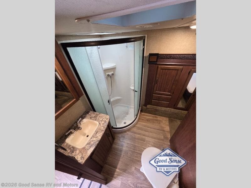 As you proceed up the stairs in the front of the fifth wheel, the bathroom is on the left. Inside the bath you will find a sink, medicine cabinet, corner shower, and toilet. There is also a private entrance into the bedroom from the bathroom.