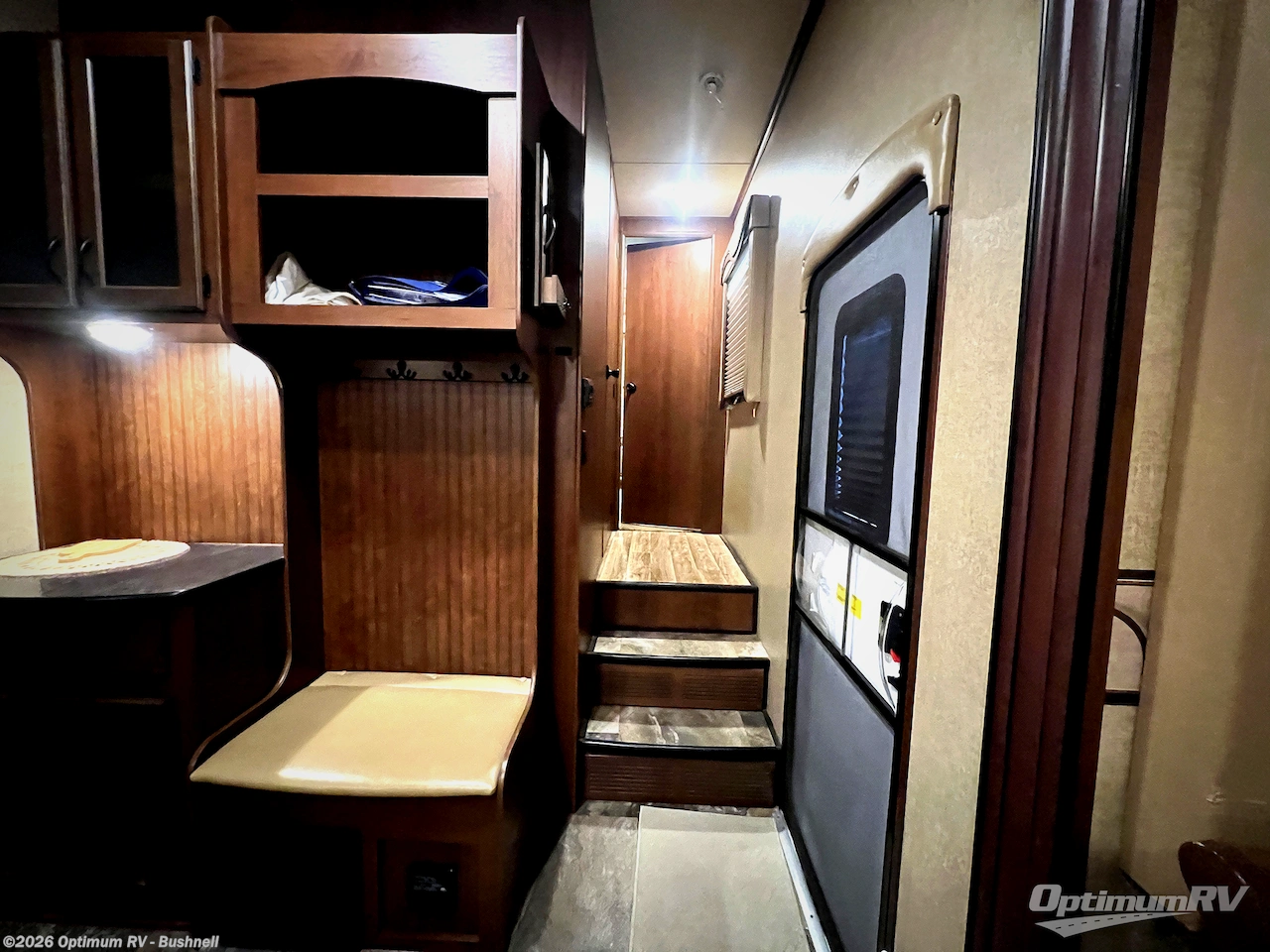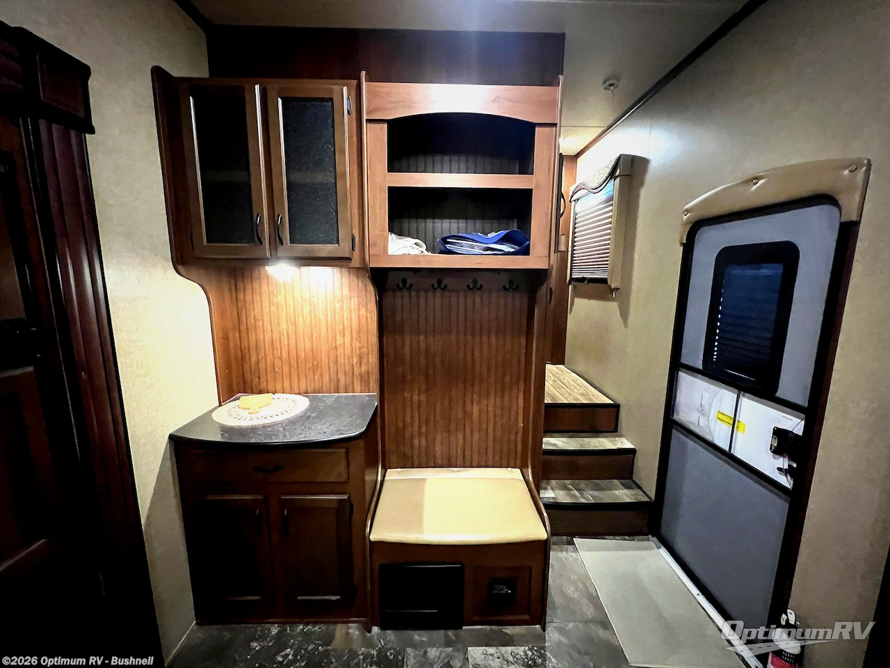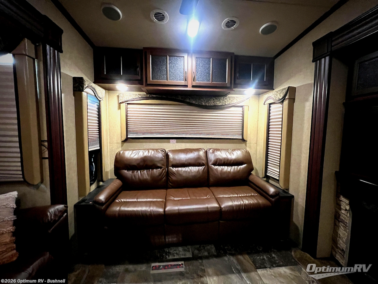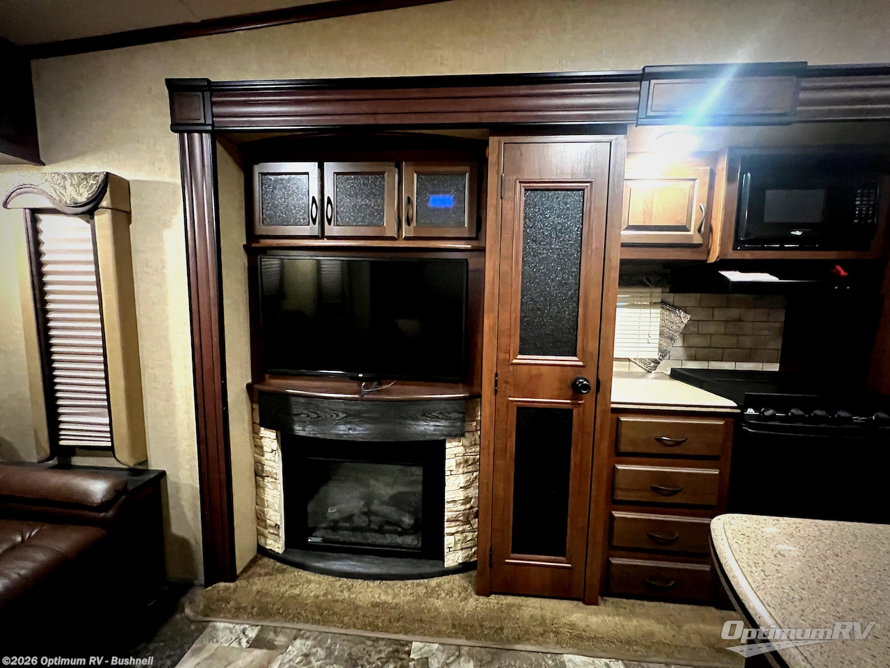 There are plenty of overhead cabinets throughout the 321RLTS as well as some options that you could choose, such as, a Ledgestone fireplace, and a 12 cu. ft. refrigerator.