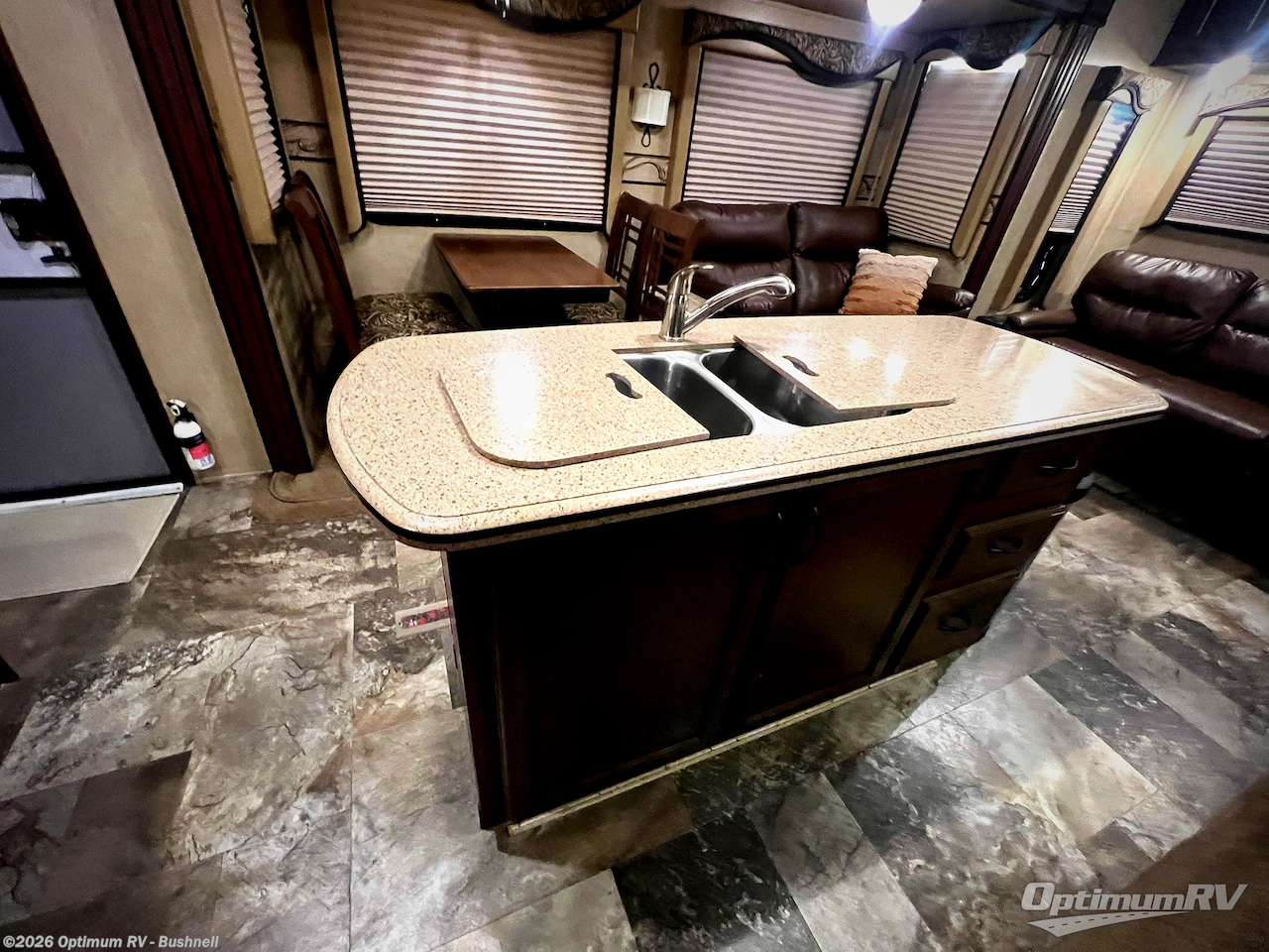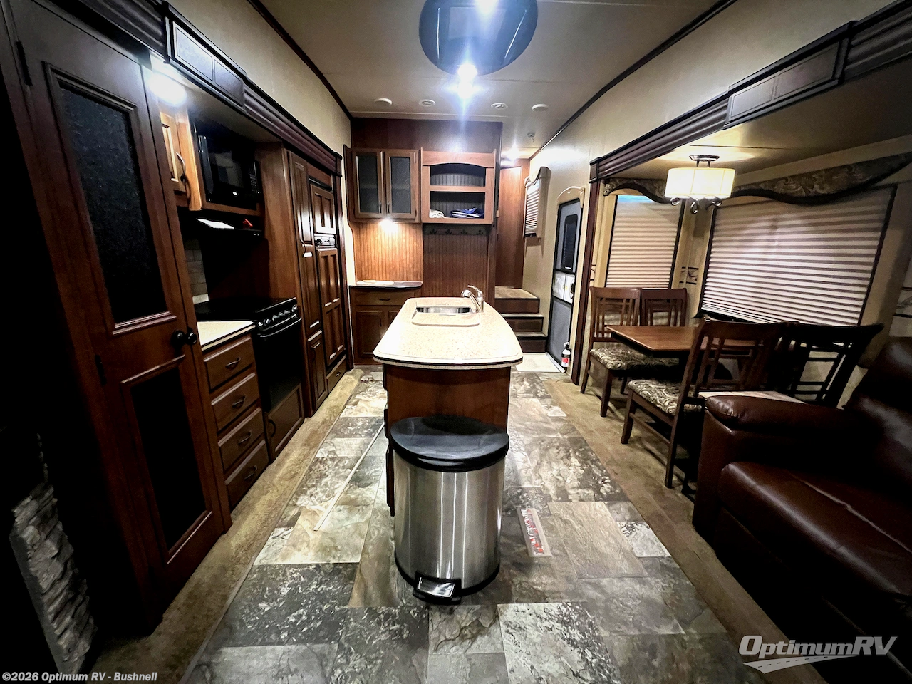 When you enter this fifth wheel, you will be in the kitchen and living areas. The kitchen has a double kitchen sink, three burner range, microwave, pantry, and refrigerator. There is much counter space with the l-shaped counter. In the living area you will find two slides, the first slide has two lounge chairs and an end table, the other slide offers a free-standing table and a hide-a-bed sofa with an ottoman. The rear wall has an entertainment center with TV lift.