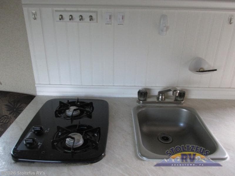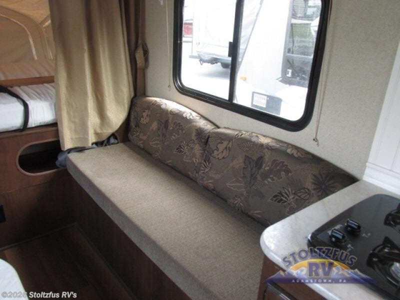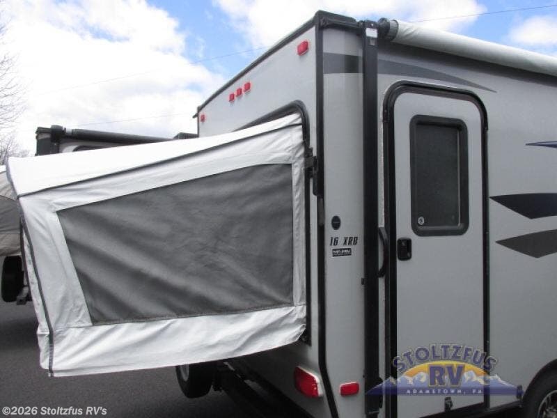 The main living area of the expandable has a refrigerator, booth dinette, sofa, two burner range, microwave, and a single sink. There are plenty of overhead cabinets throughout out the 16XRB as well as an outside awning, plus so much more!
