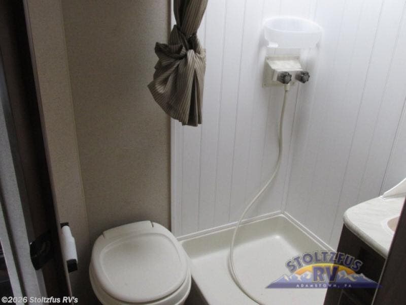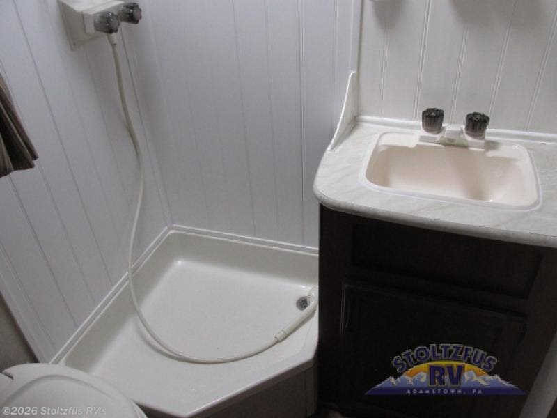 As you enter the expandable, the bathroom is in the rear corner. You will find a toilet, corner shower, and a sink.