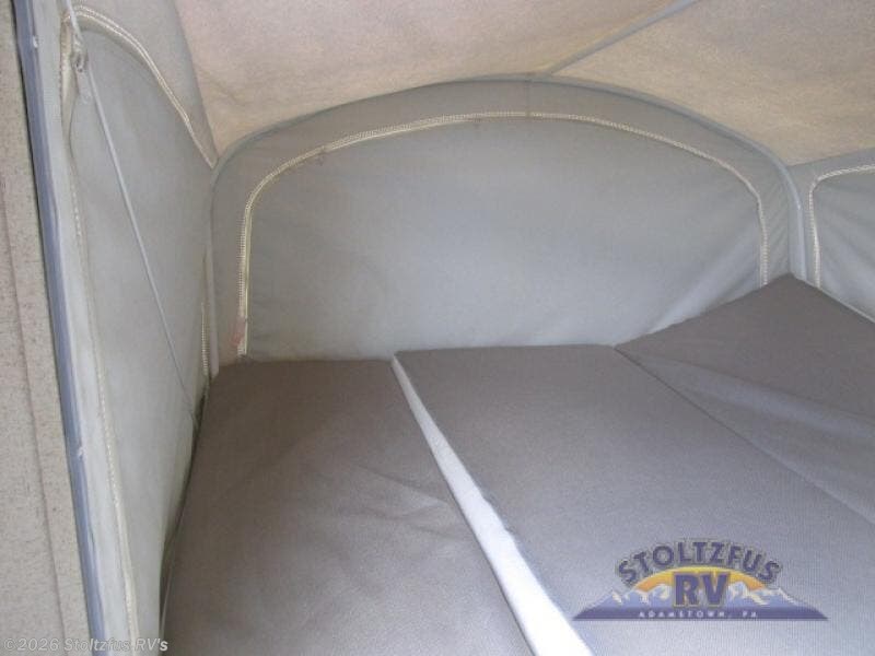 Two expandable 60" x 70" tent beds and overhead shelves are located at the front and rear of this model.