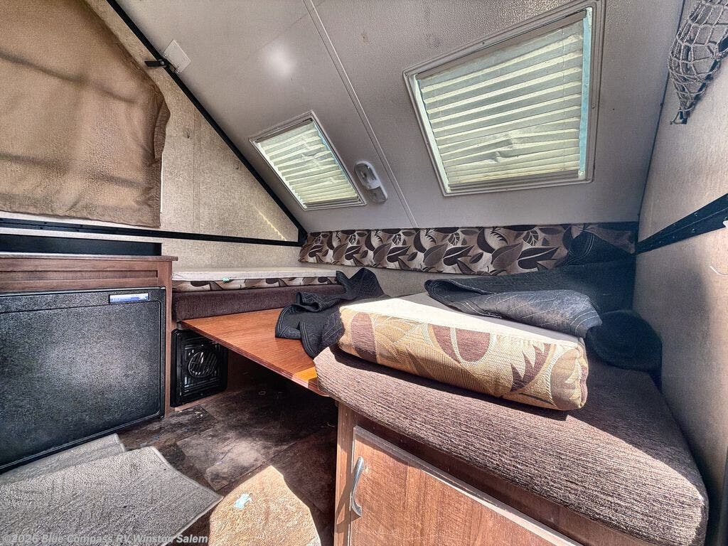 As you enter the camper, to the right there is a dinette. One side of the trailer offers a three burner range and sink. Along the rear of the trailer you will find a full bed. Next to the bed there is a cabinet.