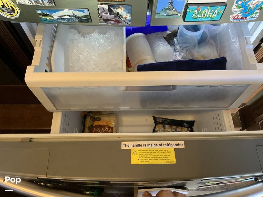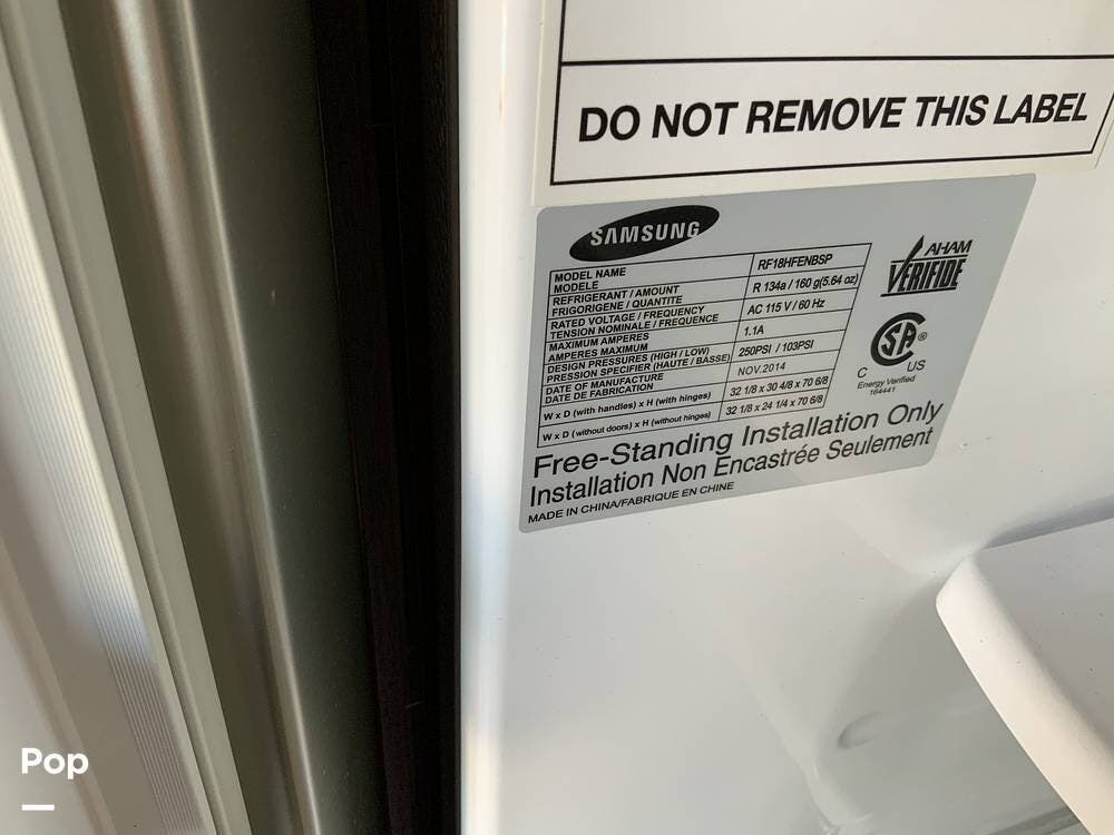 The mid-kitchen includes a full-size refrigerator, pantry, convection microwave, and generous counter space. The master bedroom is located in the rear, with a king-size bed, a large wardrobe, a dresser, and a washer/dryer hookup.