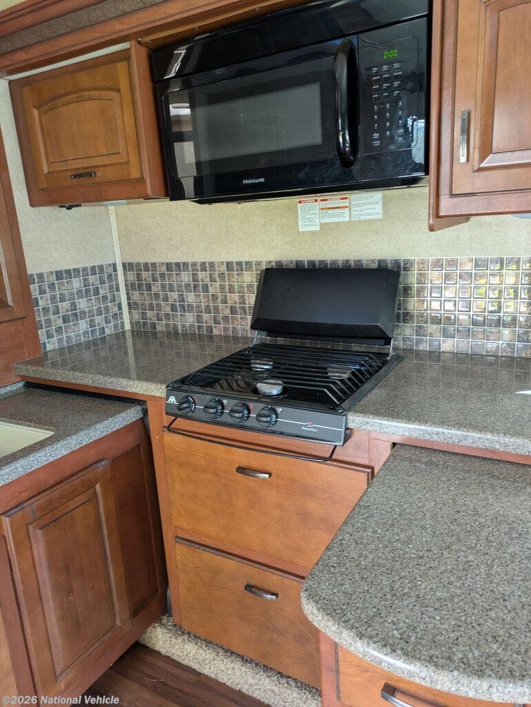 The well-equipped kitchen provides everything you need to prepare meals on the road, featuring solid surface countertops, a refrigerator, stove, oven, microwave, and generous cabinetry for storage. Whether you?re cooking a quick breakfast or a full dinner, this kitchen is designed to handle it with ease.