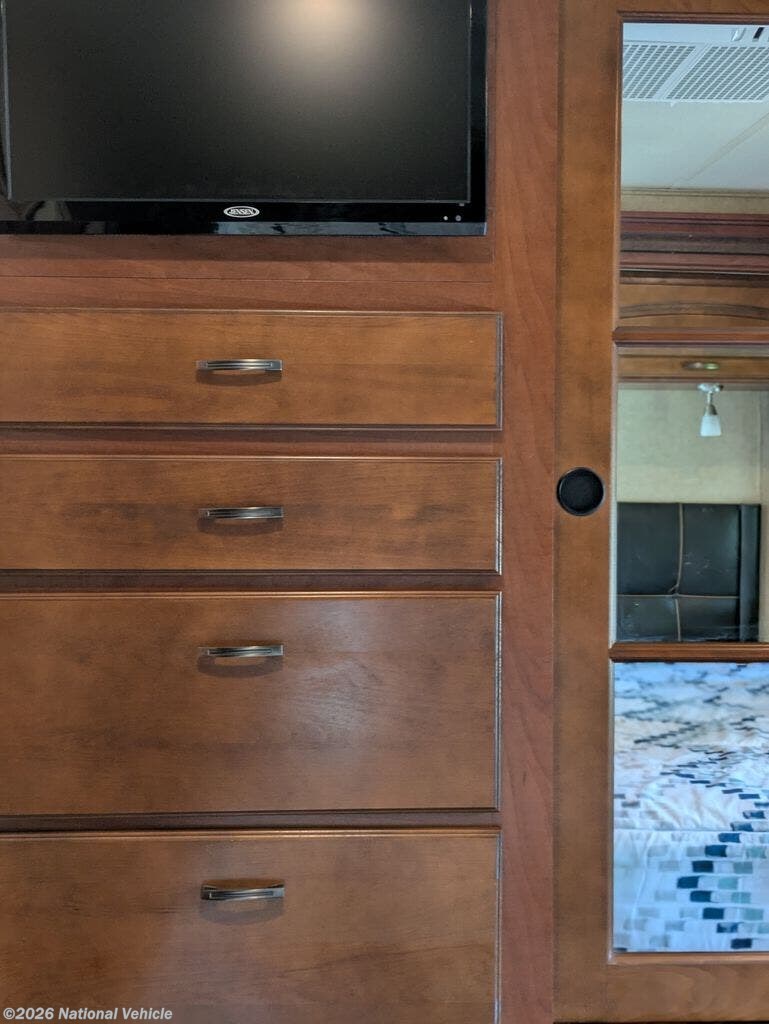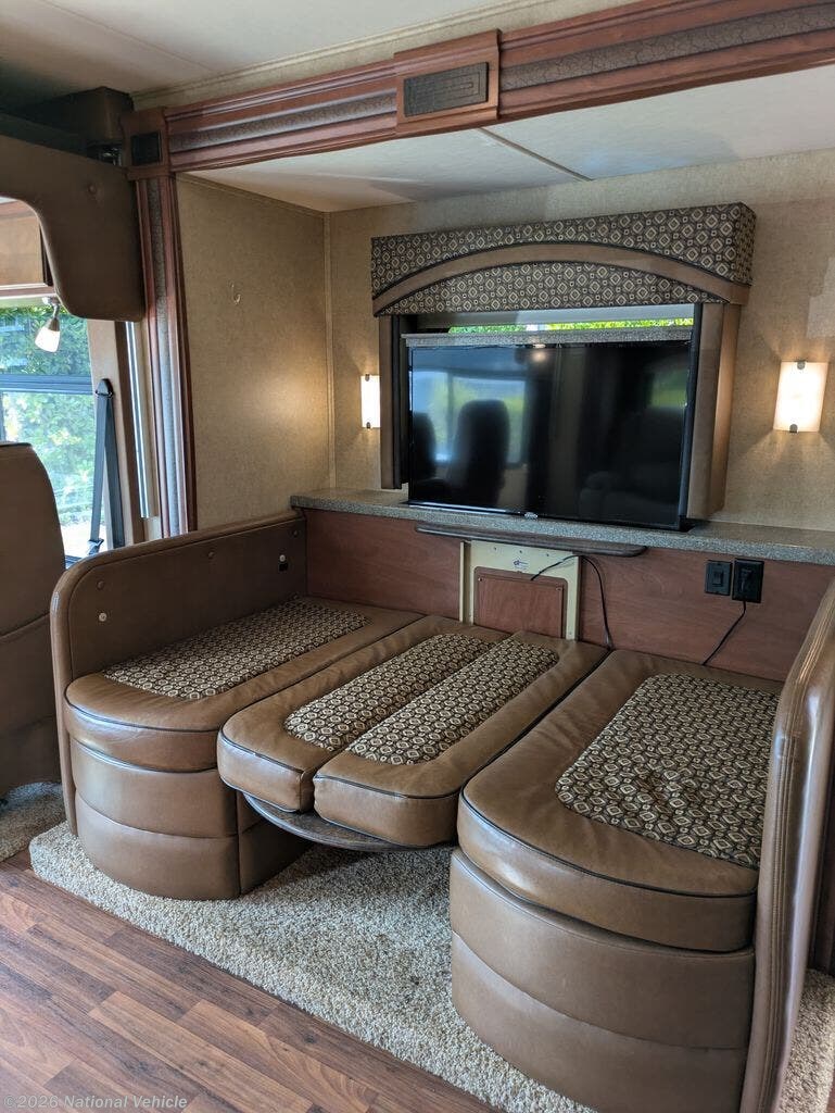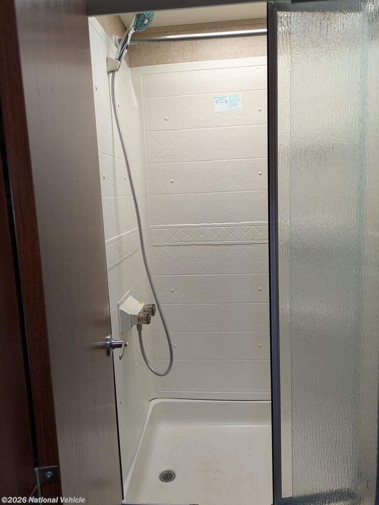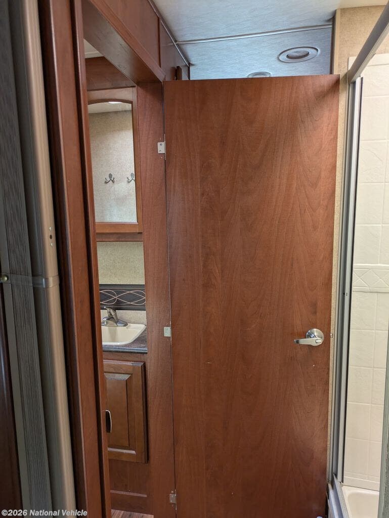 Toward the rear of the coach, the private bedroom offers a comfortable bed, wardrobe storage, and additional cabinetry to keep your belongings organized while traveling. The spacious bathroom includes a large shower, vanity, and toilet, providing the convenience and comfort of home wherever your journey takes you.