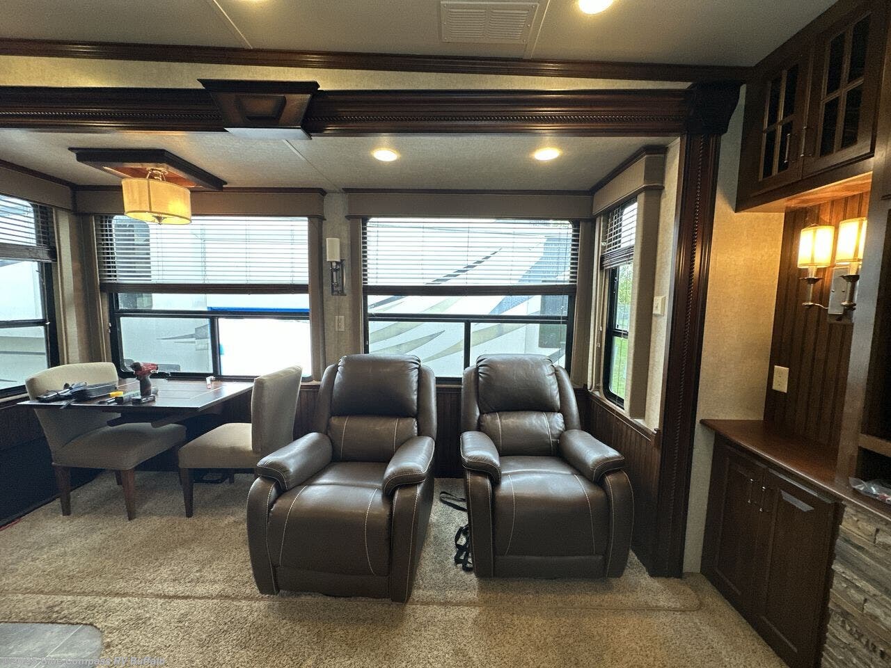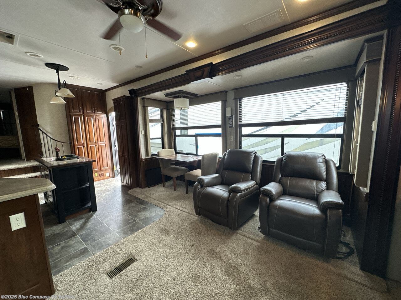 To the immediate left of the entrance there is a slide out free standing dinette and reclining sofa. Perfect for added guests when you need more sleeping space at night. The full rear wall features an entertainment center with LED TV for your enjoyment. Opposite the sofa is a small slide out section for two lounge chairs. There is also overhead cabinetry above the space.