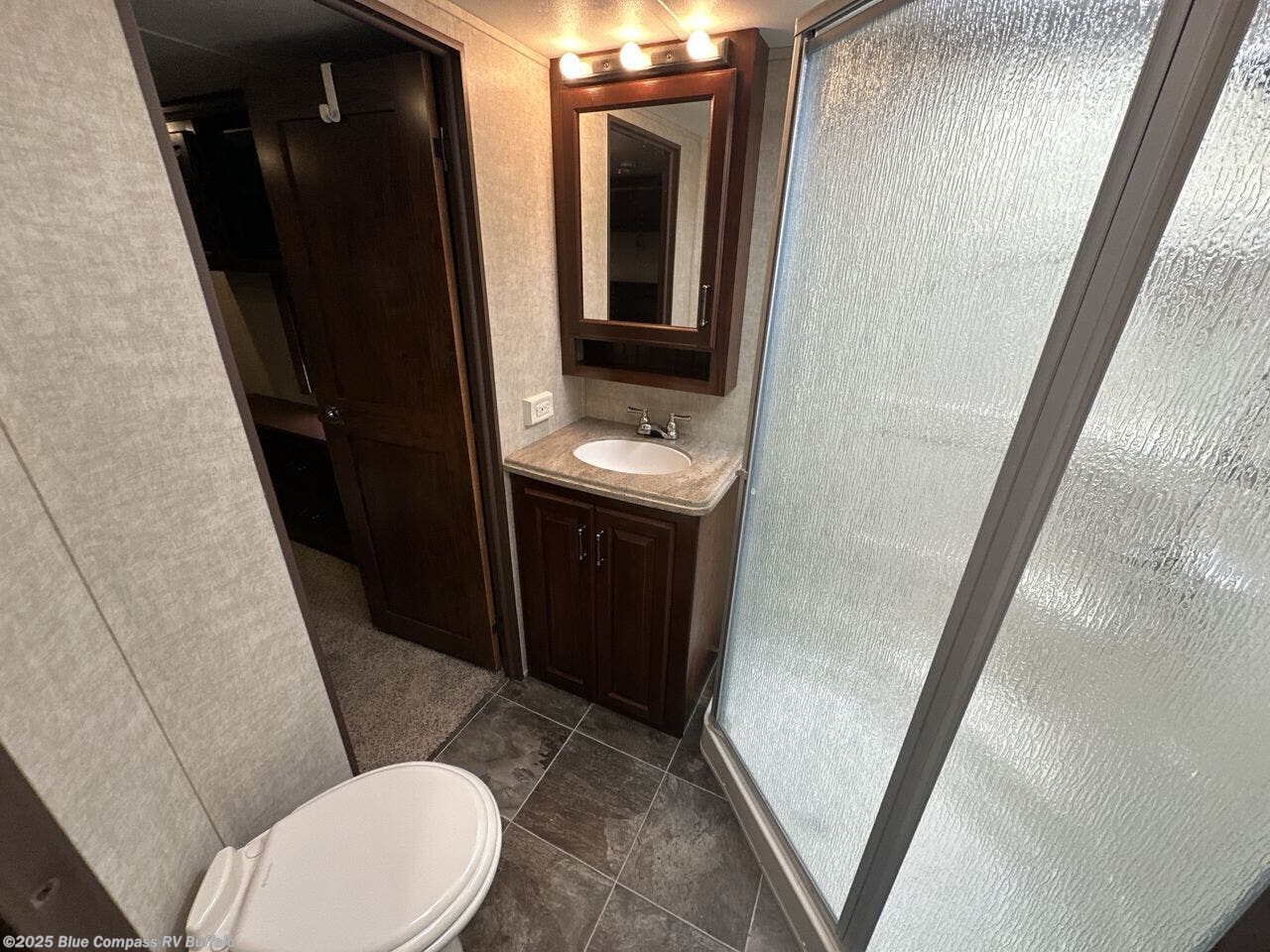 Head back through the unit to a set of steps that takes you to a side aisle bath and front master suite. The bath features an angled shower, toilet and sink with shelf above. There are two bath entry doors for hall and bedroom access.
