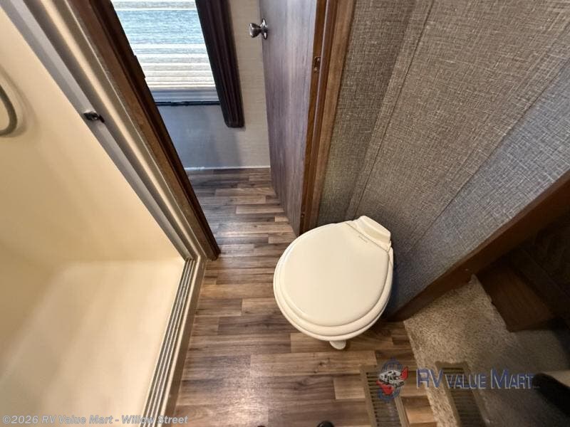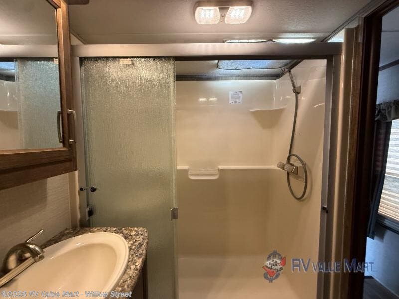 Take the steps up along the rear wall to a front bedroom and side aisle bath. The bath includes a shower, toilet, and vanity with sink plus overhead storage. A sliding second door in the bath allows you immediate access into the front bedroom.