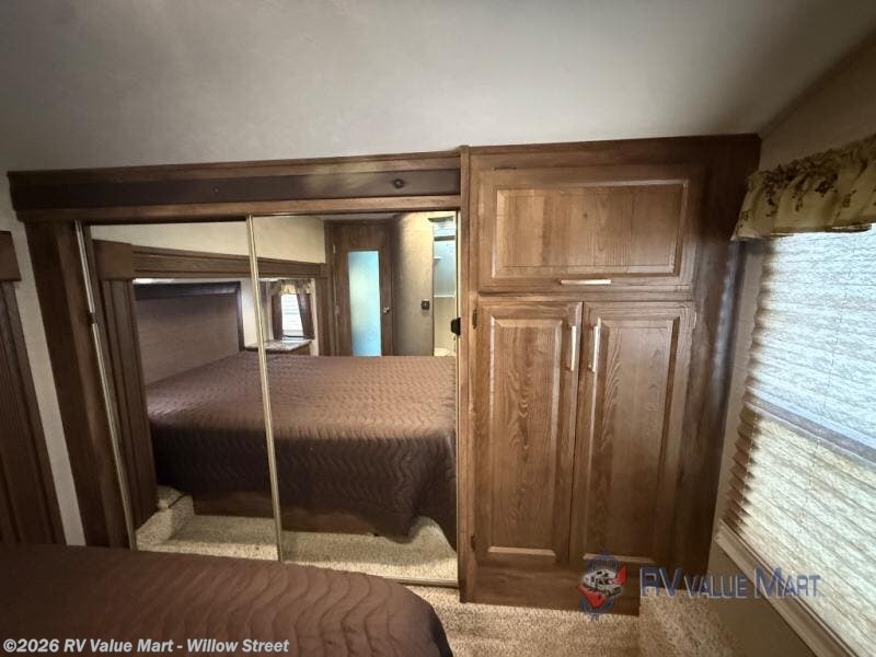 There is also a hall entry door to the front private master suite featuring a queen bed slide with nightstand. A chest of drawers opposite the bed provides plenty of drawer space for all of your things. Along the front wall a full height wardrobe with a sliding door makes room for all of your hanging clothes, plus there is also a nightstand too. A corner wardrobe has been prepped for a washer and dryer for added convenience if you choose to add, and so much more!