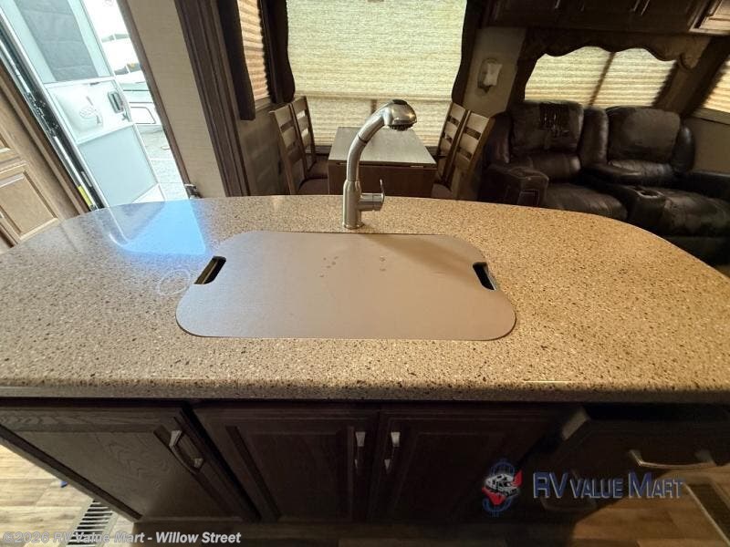 The side opposite the door features an entertainment center with 40" LCD TV, plus an optional fireplace can be added if you like. There are also kitchen appliances in this entertainment center slide which includes a pantry, counter area, three burner range, and refrigerator. The handy island is off center and is the location for the double kitchen sink.