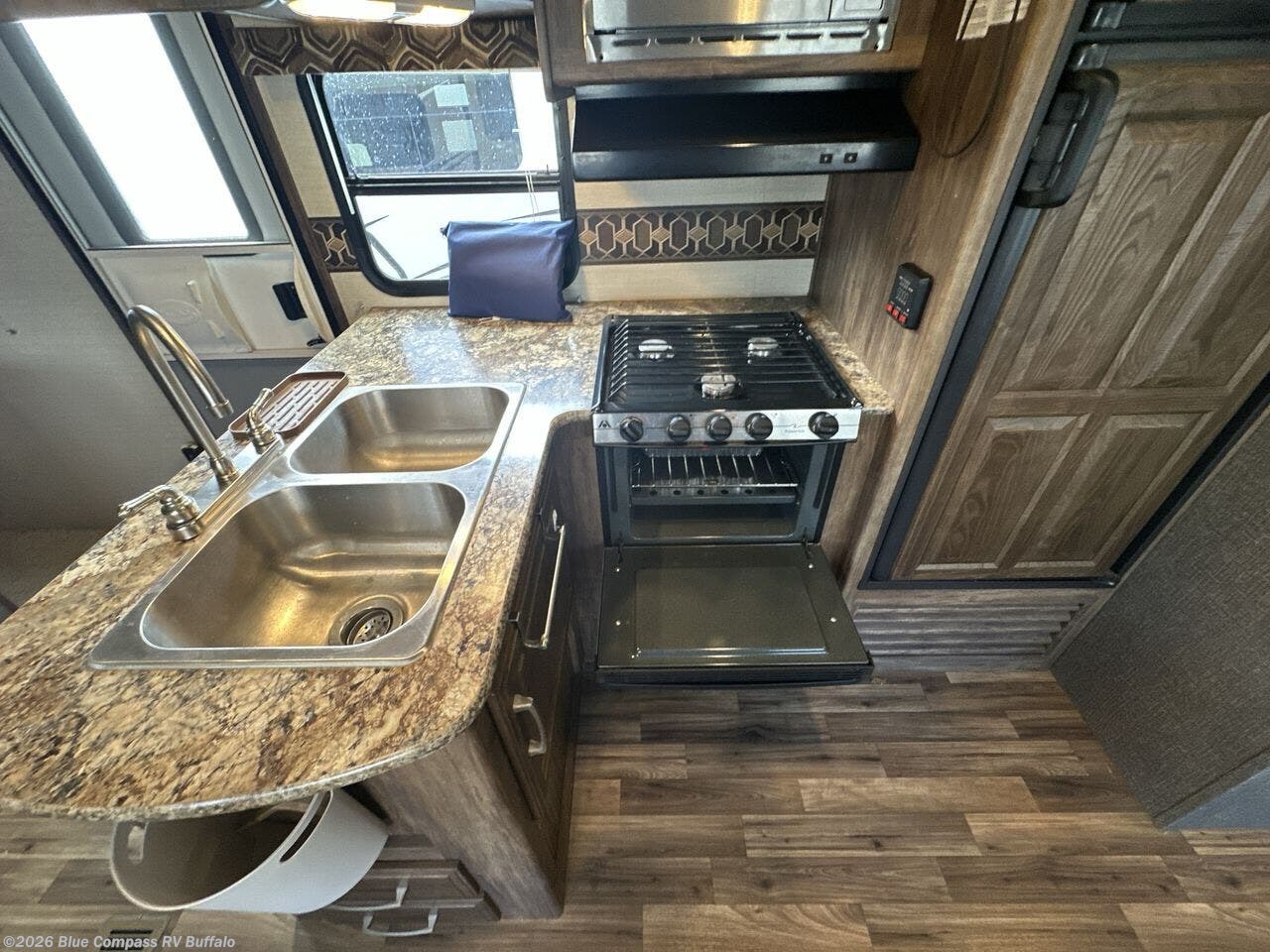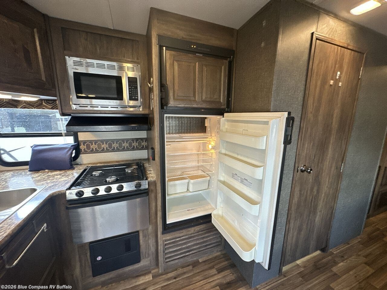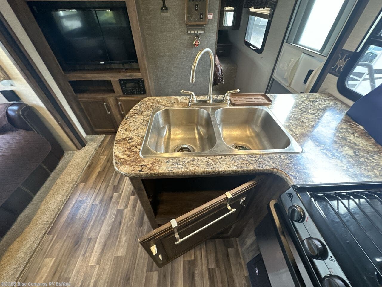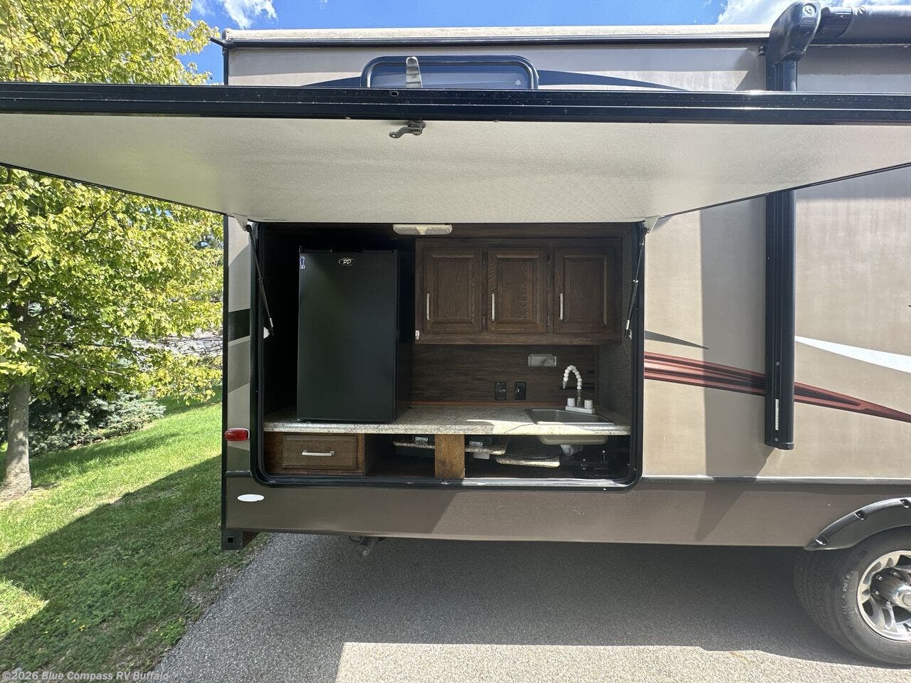 On the outside there is plenty of exterior storage space in the front pass-through compartment for all of your outdoor camping gear, and the rear offers an outdoor kitchen, plus flip out stove top, and so much more!