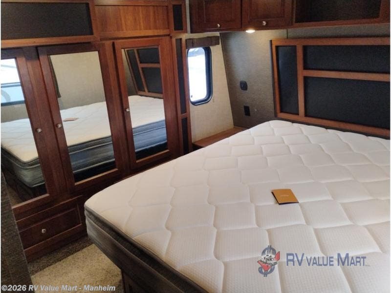 In the bedroom you will sleep comfortably on a residential queen bed or optional Fuzion king with overhead storage, plus storage on both sides of the bed as well. Enjoy watching a little TV when you retire for the evening which is mounted on the wall opposite the bed, plus so much more!