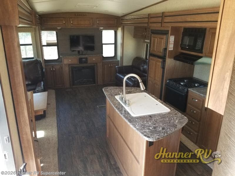 This Laredo Super Lite FW model 297SRE features a spacious interior with triple slides, a rear entertainment layout, and a convenient kitchen island, plus more!