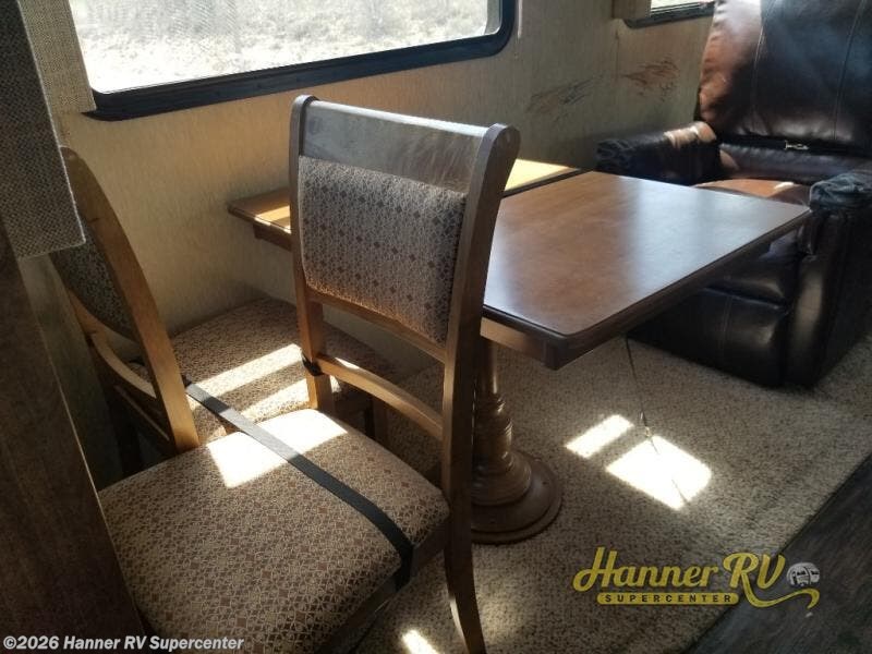Step inside and be greeted by a combined kitchen and living area with dual opposing slides that when fully extended create a wide open feel. There is a booth dinette slide out to the left of the door with two lounge chairs in the space as well.