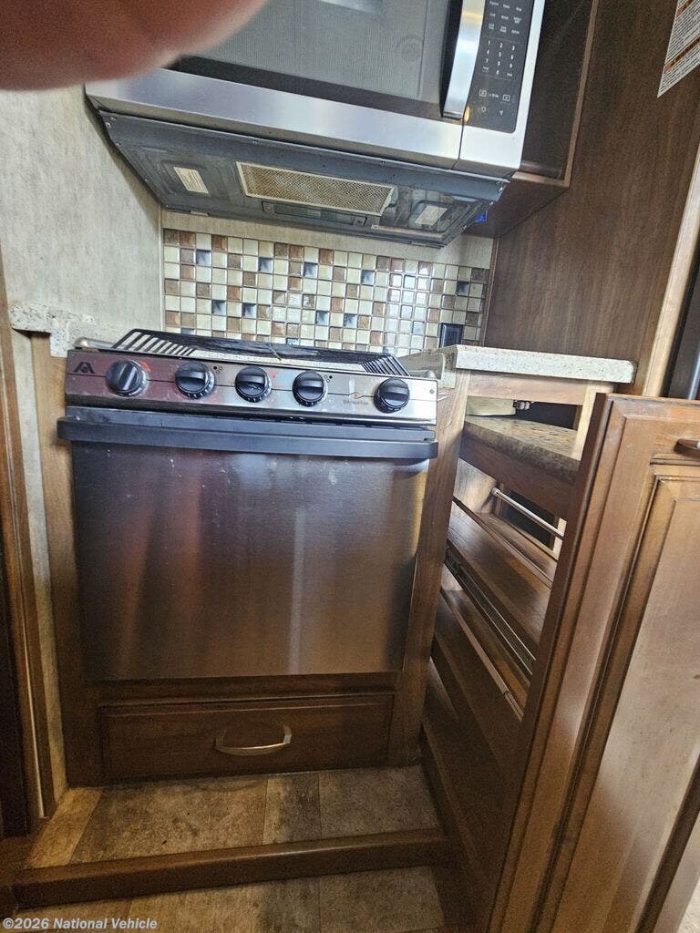 The kitchen includes one slide out and is beautifully laid out with solid-surface countertops, an island for extra prep space, a large pantry, and all the appliances you'd expect ? including a fridge, oven, microwave, and three-burner stove. Across from the kitchen, there?s a dinette so you can enjoy a proper sit-down meal.