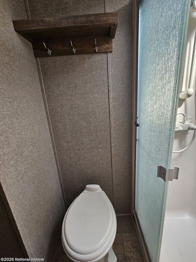 Up front, the master bedroom features a slide out queen bed, a large wardrobe, and plenty of storage. The bathroom includes a big shower with glass doors, a porcelain toilet, and a vanity with ample counter space.
