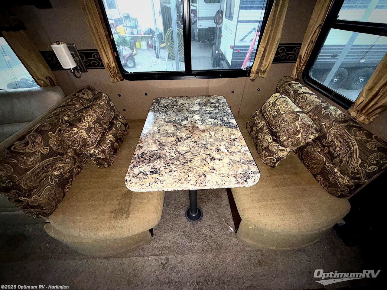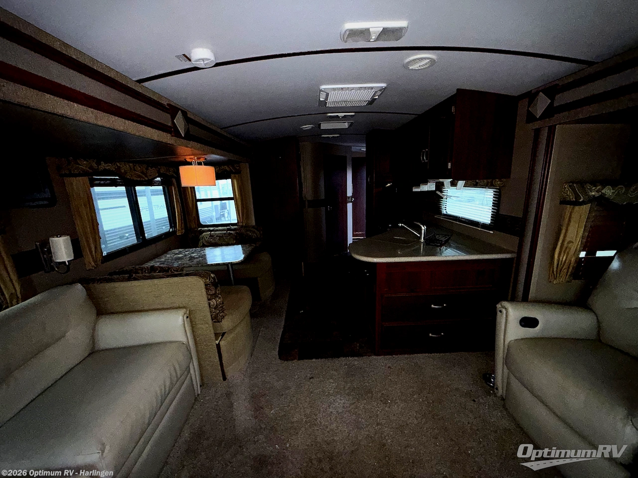 As you make your way to the open living area notice the rear wall entertainment center with overhead cabinets, and pop-up LCD TV. There are also storage cabinets below for your things. You can easily enjoy conversations or television watching from the two lounge chairs in the slide to the left looking back, or from the sofa sleeper with overhead cabinets in the slide on the right which also includes a nice booth dinette for dining.