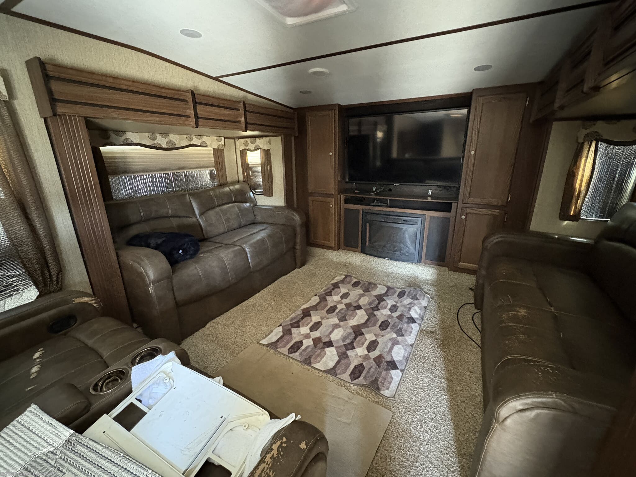 This is a front living fifth wheel with 4 slide rooms that is very affordable. The front living area has 3 lots of seating and recliners to entertain or watch TV. The kitchen has lots of counterspace and cupboard storage. The bedroom features a queen bed, a dresser and closets. There are a few scuffs, but there are NO foul smells and is priced right!