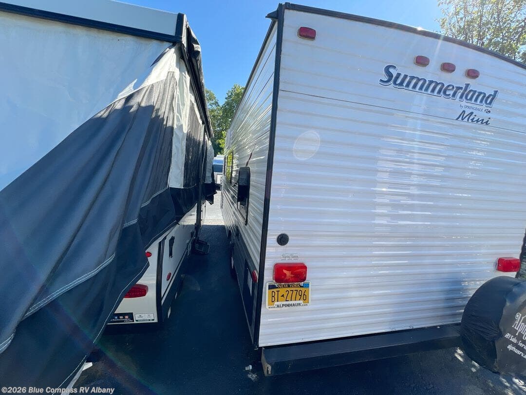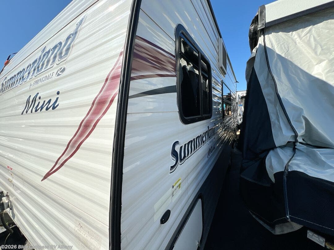 The largest of the single axle Summerland Mini's by Keystone RV is this 1800BH model. Inside this trailer find a set of bunks, a rear bath area, and queen size bed, plus more.