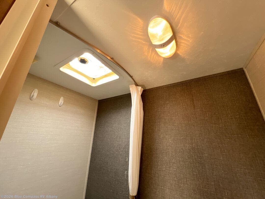 Step inside model 1800BH and notice the front queen bed with full front overhead storage, and a closet at the foot of the bed as the bed is turned width wise with the head of the bed along the road side wall. You will find plenty of storage beneath the queen bed as well.