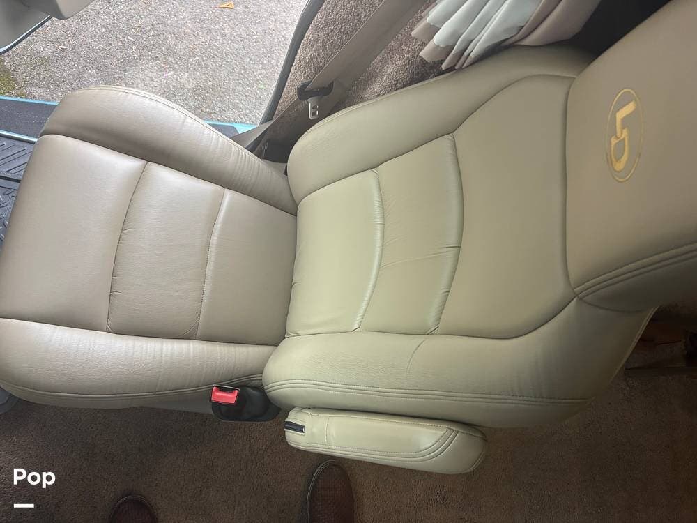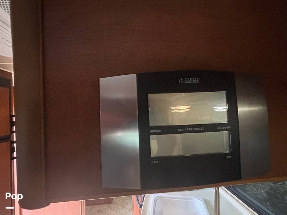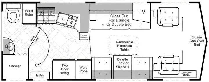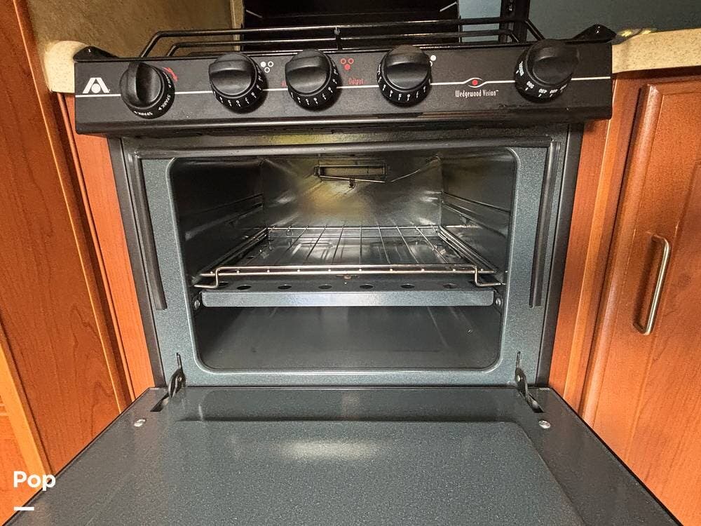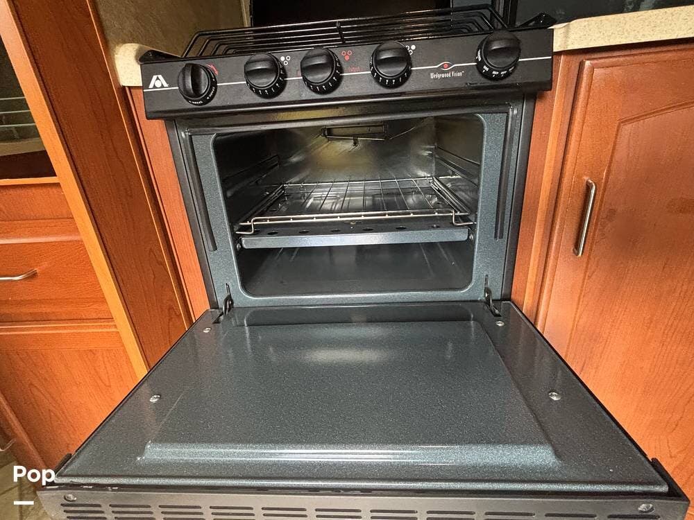 The kitchen includes a double sink, a 3-burner stove, a microwave, a refrigerator/freezer, and a pantry. Gorgeous counters sit next to a comfortable dinette. Entertainment features include a TV, stereo, and interior lighting.