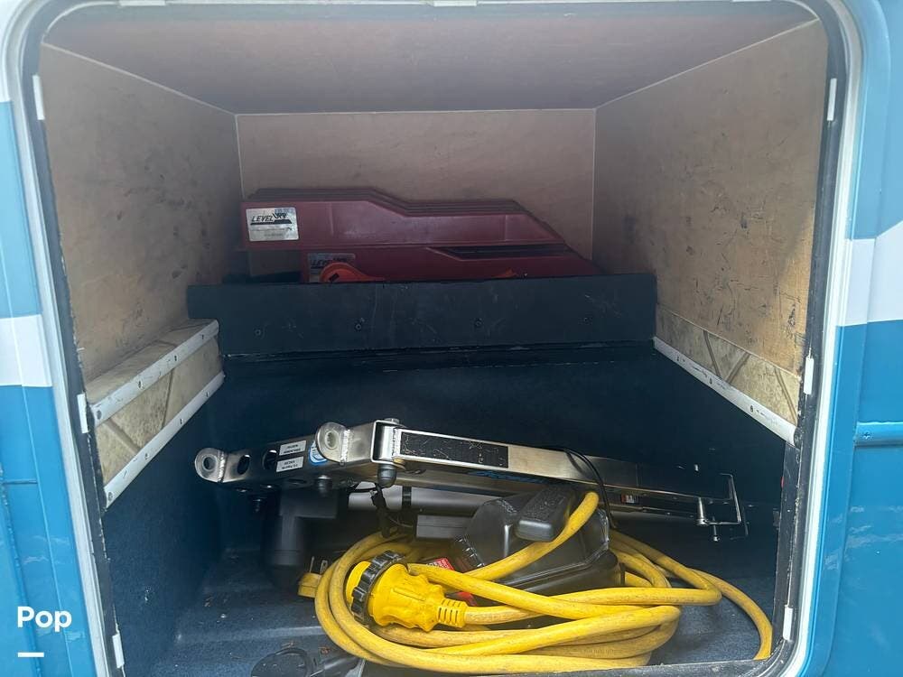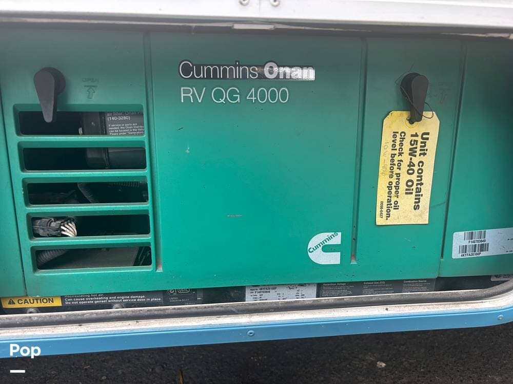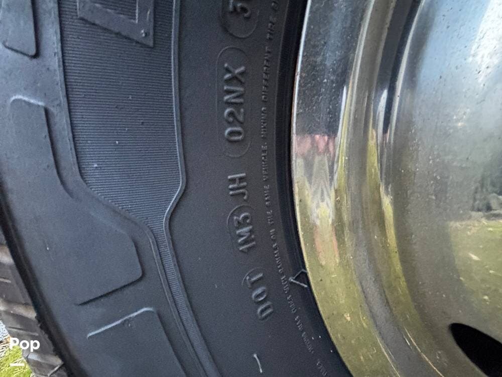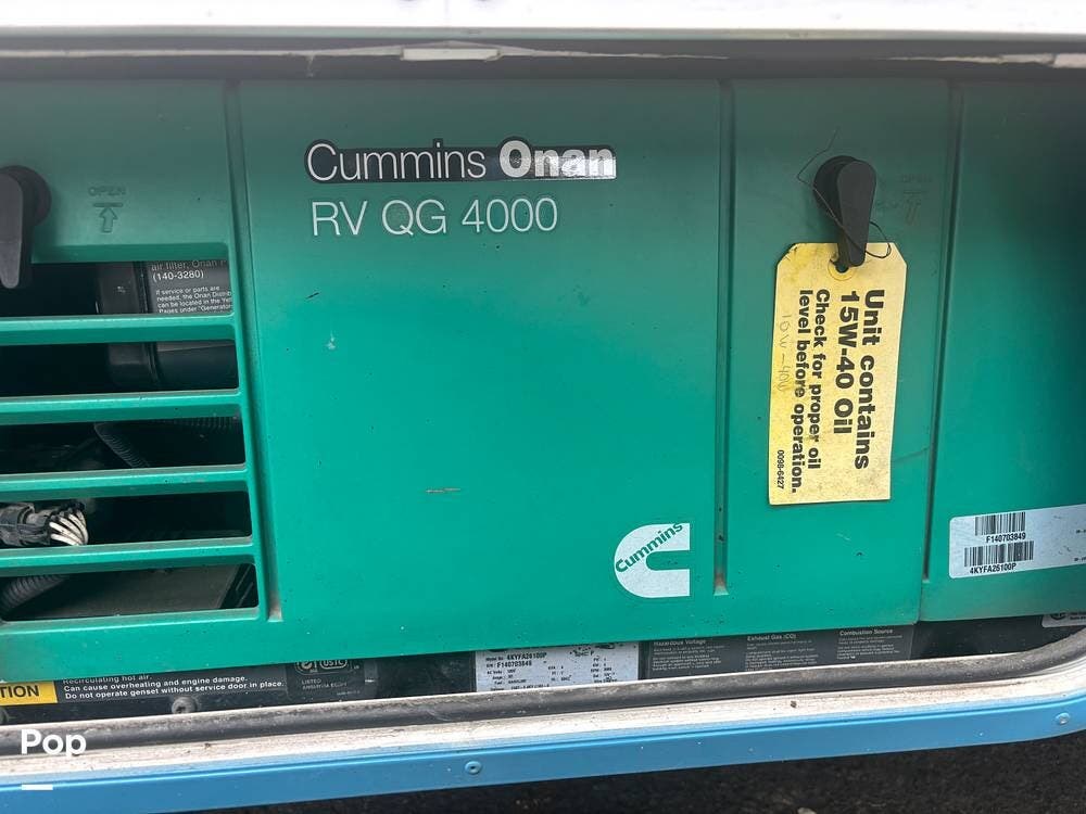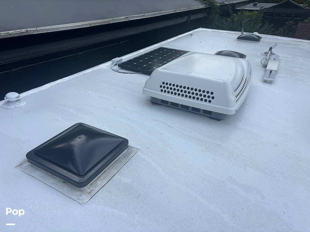 It also features a 100-watt solar panel, a generator, a water heater, a Satellite antenna, two lithium house batteries, and a city water hookup. Safety equipment includes smoke and CO2 detectors, a braking system, and a spare tire kit. Outside, there's an awning, a roof ladder, and exterior storage.