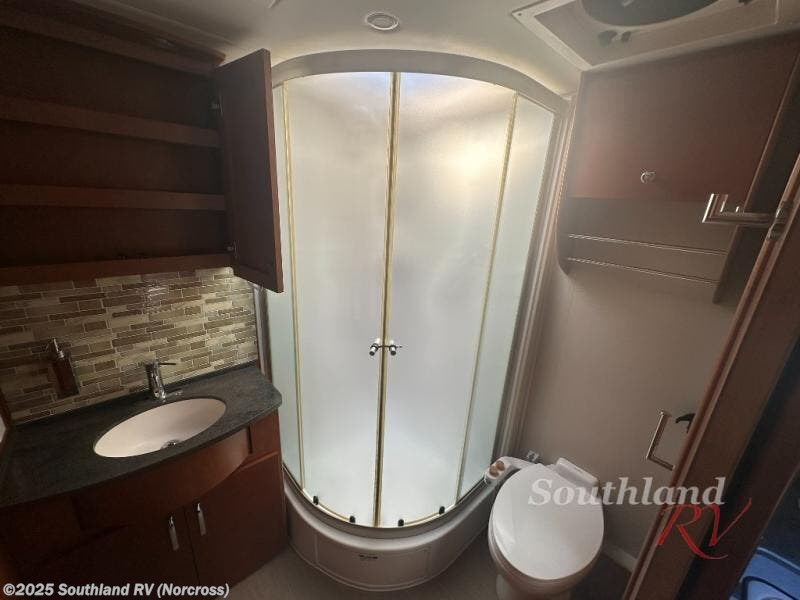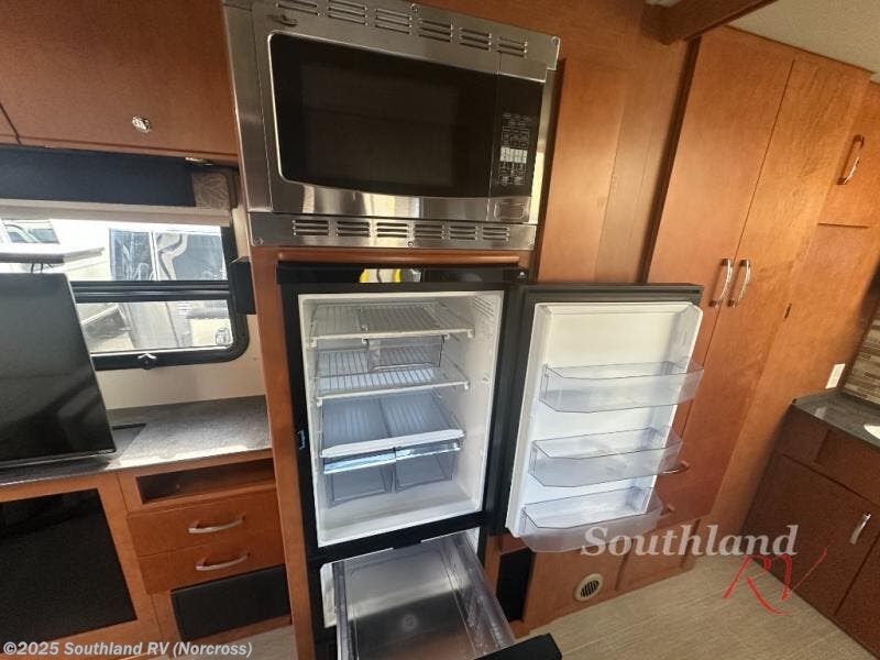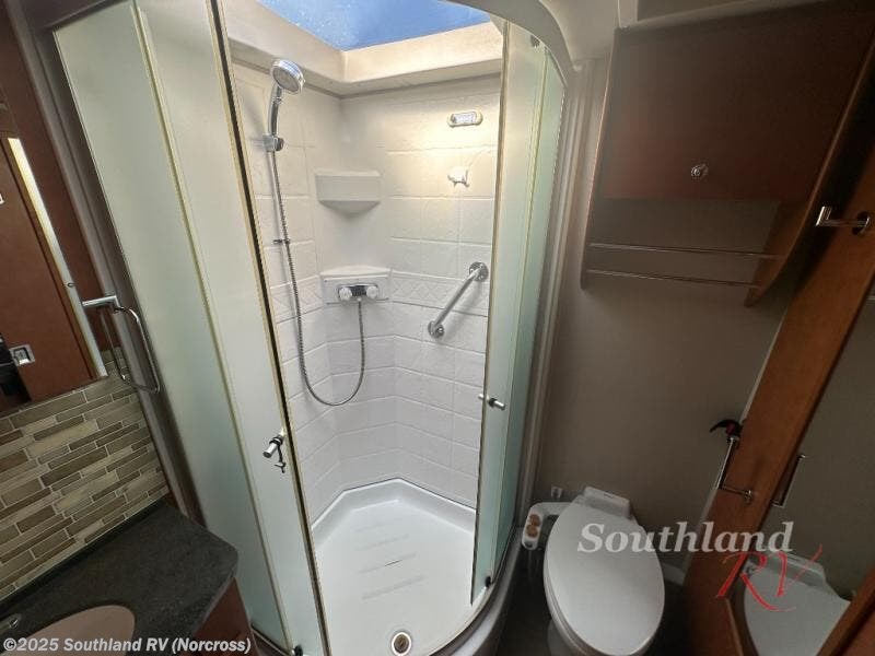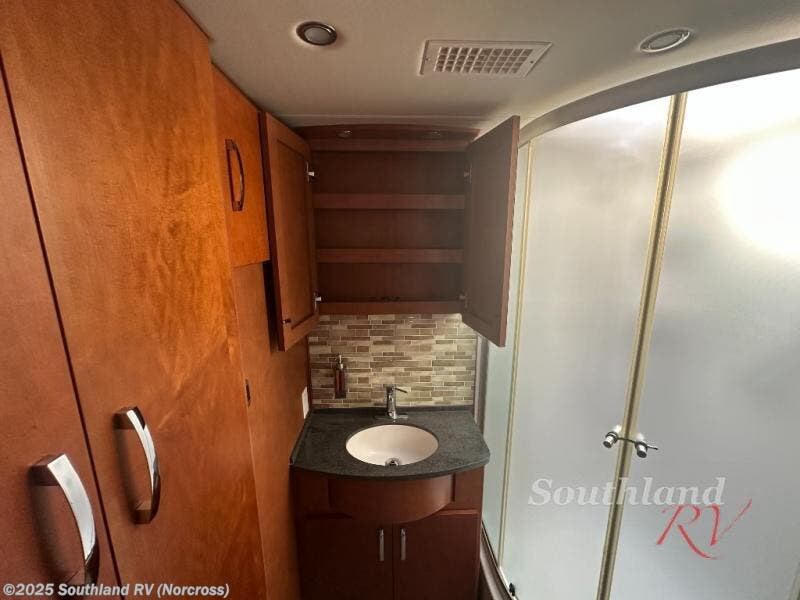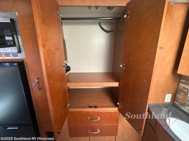 This Leisure Travel class B+ diesel unit 24MB offers a single slide out with a queen size Murphy Bed included, a pop-up 32" LED TV, curved European cabinetry throughout, and a bathroom that will make any class A owner envious.