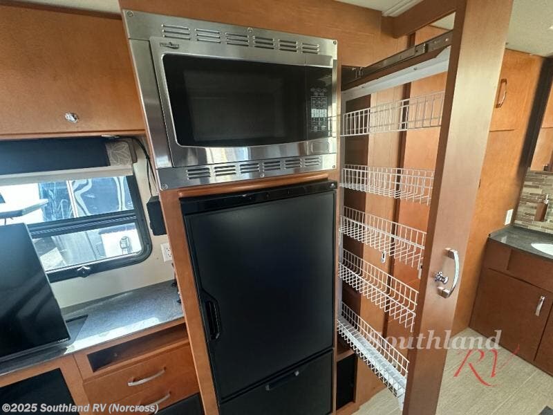 In the kitchen area find a round sink, a two burner range top, counter extension, plus upper and lower cupboards and cabinets for storage. There is a refrigerator opposite, and a pull-out pantry for even more storage for canned and dry goods. The pop-up 32" LED TV is located just inside the door to the left for your viewing pleasure.