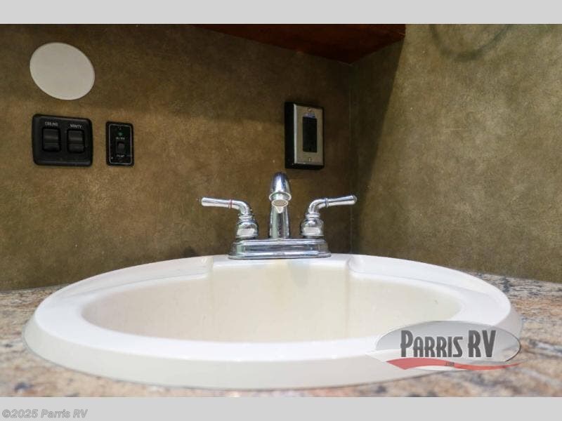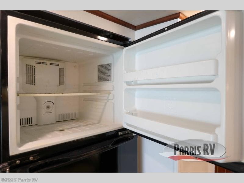 As you enter the motor home, to the left is a double kitchen sink, three burner range, and refrigerator. The opposite side offers a full wall slide with a sofa, dinette, pantry, wardrobe, two shirt closets, a chest of drawers, and an overhead TV.