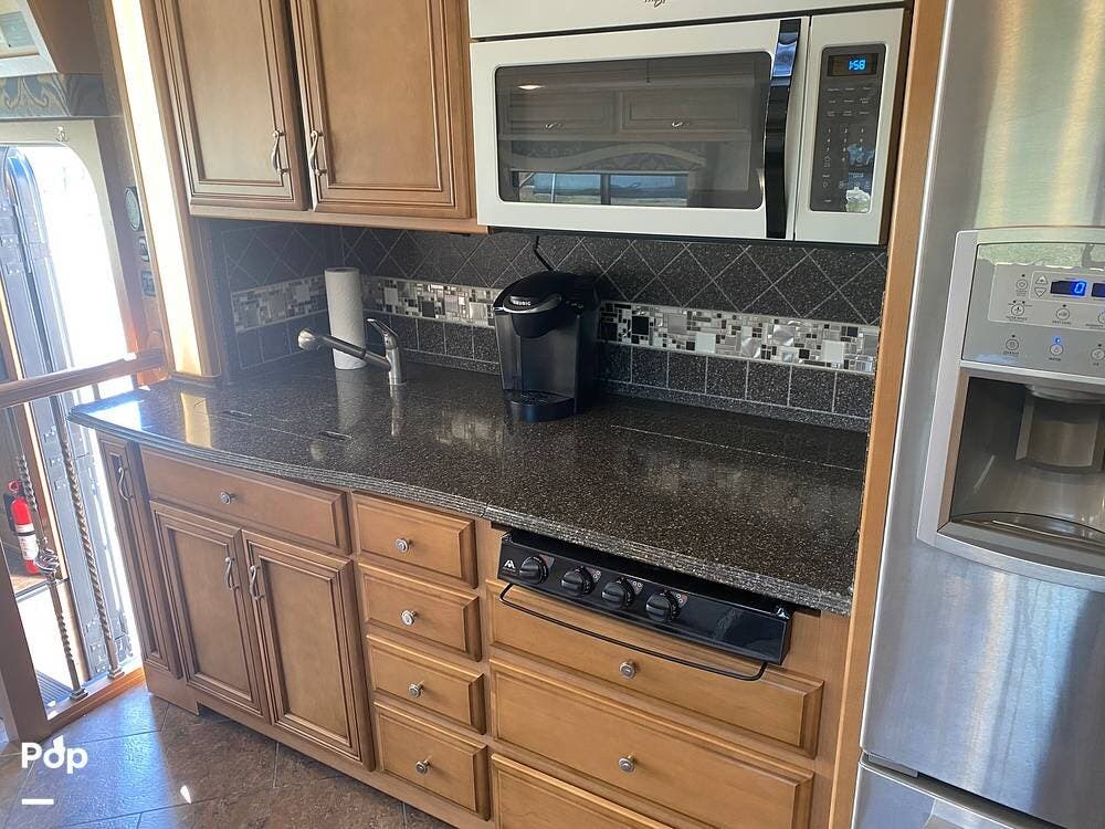 The kitchen has solid countertops, a convection microwave, a residential refrigerator with an indoor dispenser, dual A/Cs, a stackable washer/dryer, a bath and a half, and master sleeping quarters with a king-size bed and under-bed storage.