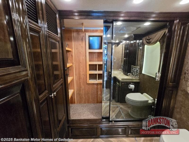 In the rear of the motor home you will find a large bathroom. The bathroom has a shower, linen cabinet, washer and dryer, wardrobe with sliding mirror doors, adjustable shelves, toilet, and two sinks.