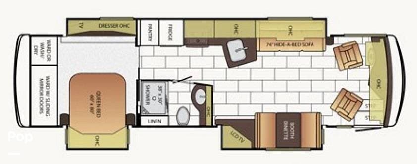 The 2015 Newmar Ventana 3436 diesel-pusher motorhome features three power slide-outs that expand the interior living space. As you enter the coach, the front living area is arranged with swivel driver and passenger captain's chairs that face the interior, and a full-wall slide-out on the driver's side that houses the entire kitchen, extending into the bedroom dressers, along with the large hide-a-bed sofa opposite the entry door.