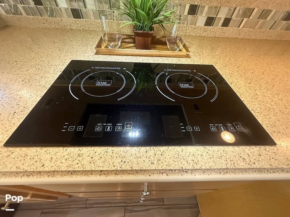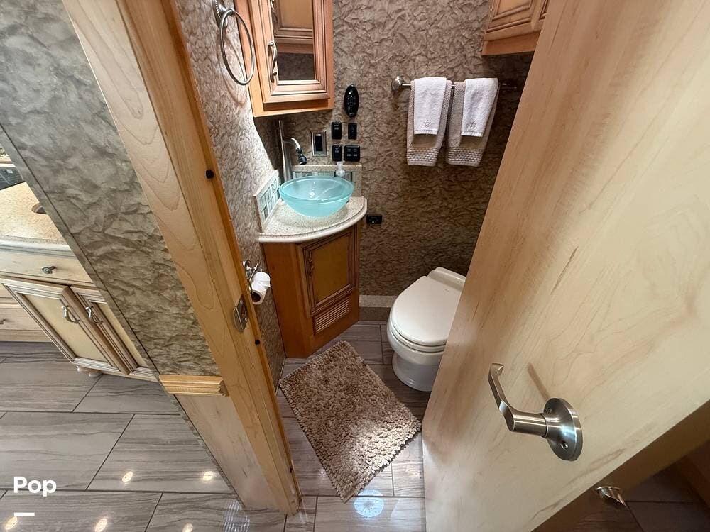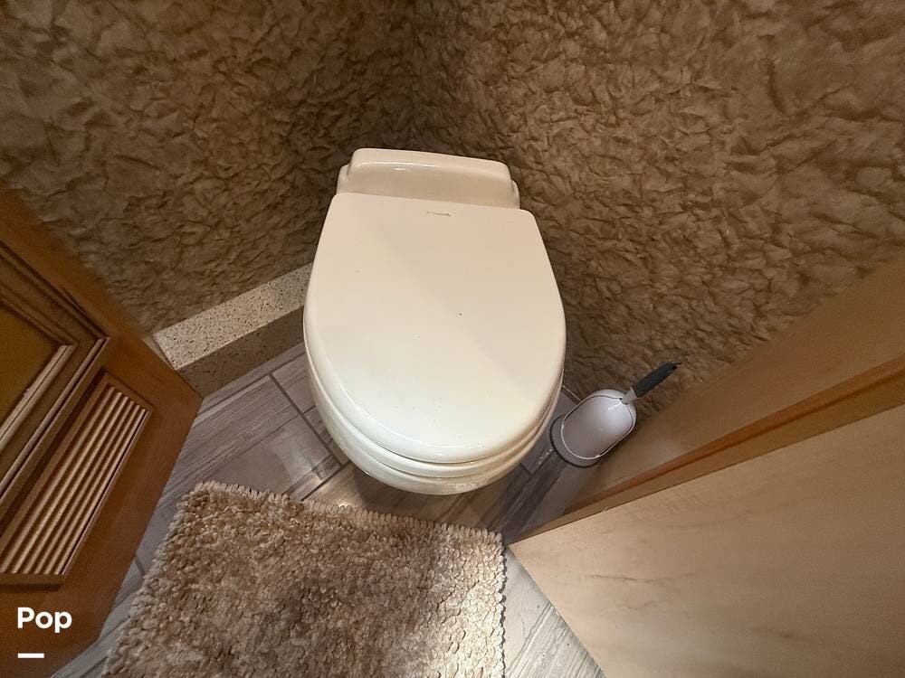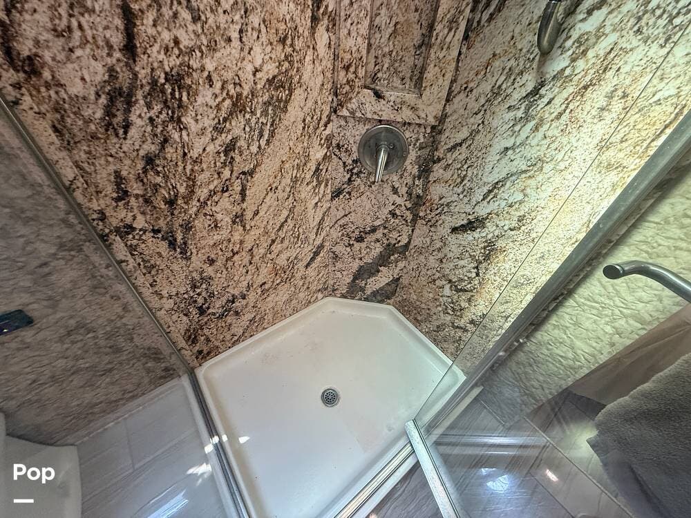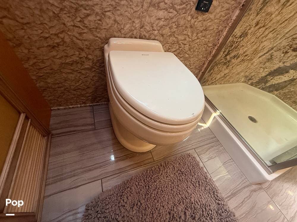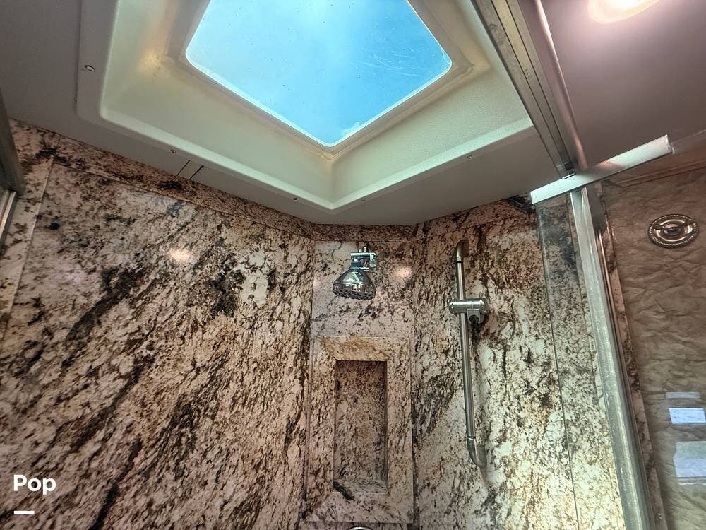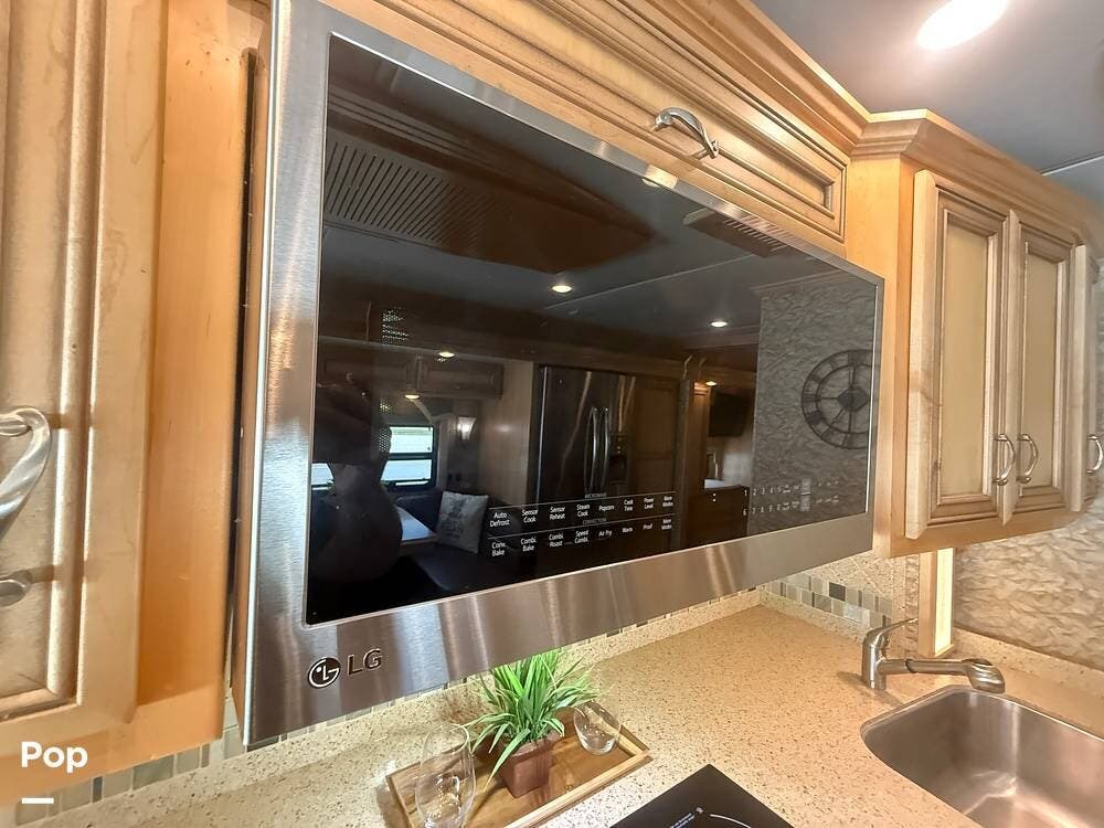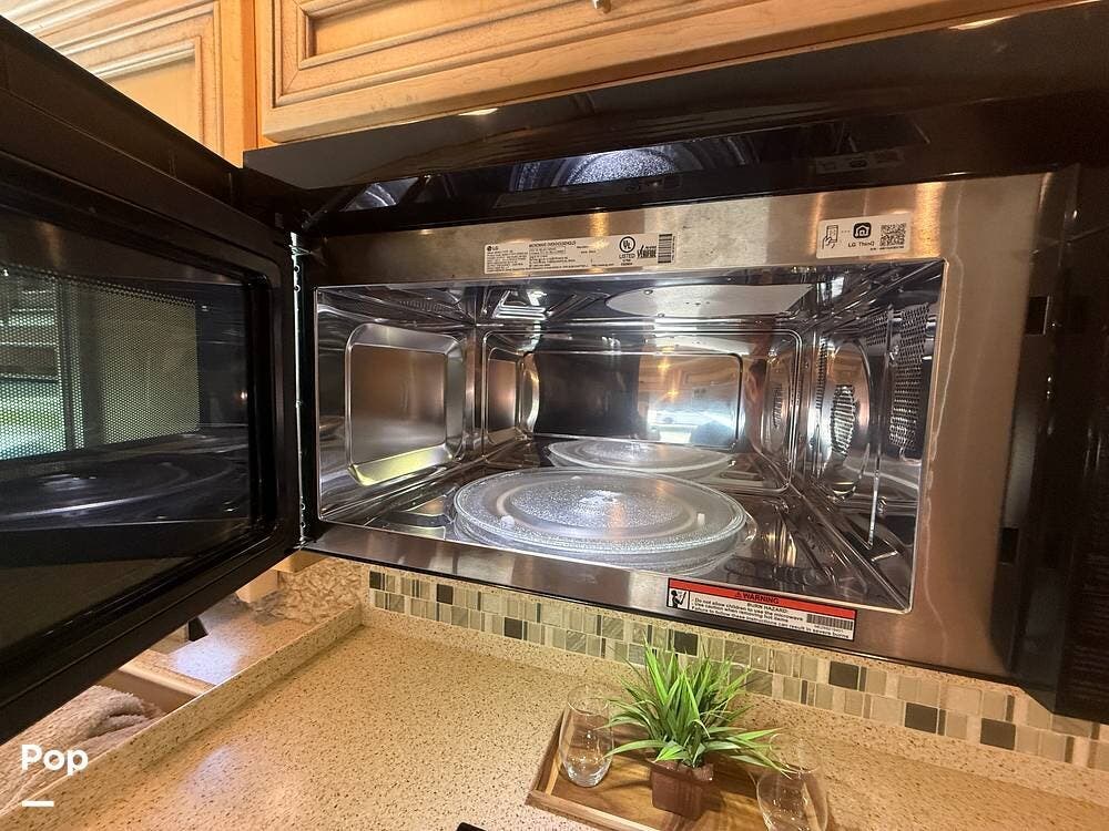 The kitchen has a convection microwave, a residential refrigerator, and solid surface countertops. The main suite features a private bathroom with a spacious shower, a king-sized bed, and a generous wardrobe. Additionally, this model has a half-bath mid-coach for visitors.