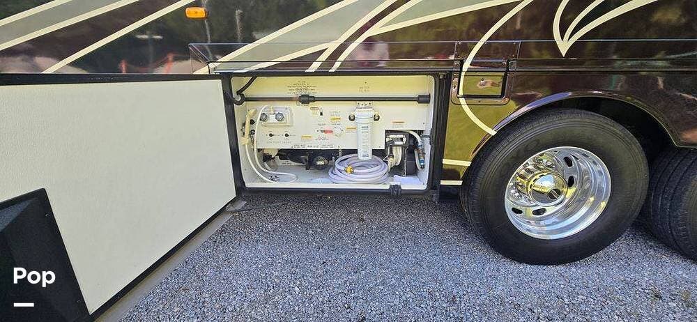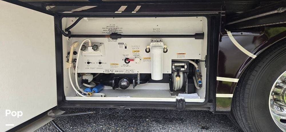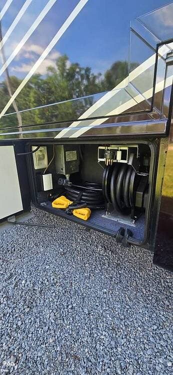 Outside, the experience continues with a power awning featuring wind sensor protection and a removable sunshade, exterior shower, hitch, tire covers, and abundant basement storage. Snap Pads on the leveling jacks, a built-in surge guard power protection system, tire monitoring system, and eight new Toyo tires paired with eight new Interstate house batteries reflect the care and investment put into this coach.