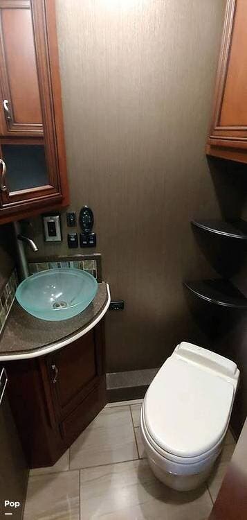 The layout offers exceptional privacy and functionality with a convenient half bath located mid-coach and a true master suite in the rear. The bedroom features a king Sleep Number bed, dual wardrobes, a built-in dresser, and washer and dryer for complete independence on the road. The master bathroom feels spa-like, with double sinks, generous storage, and a large walk-in shower, while both bathrooms are equipped with macerator toilets for modern convenience.