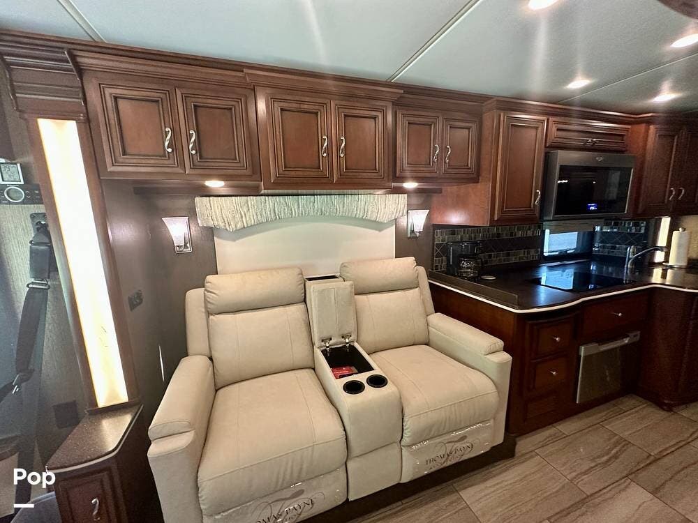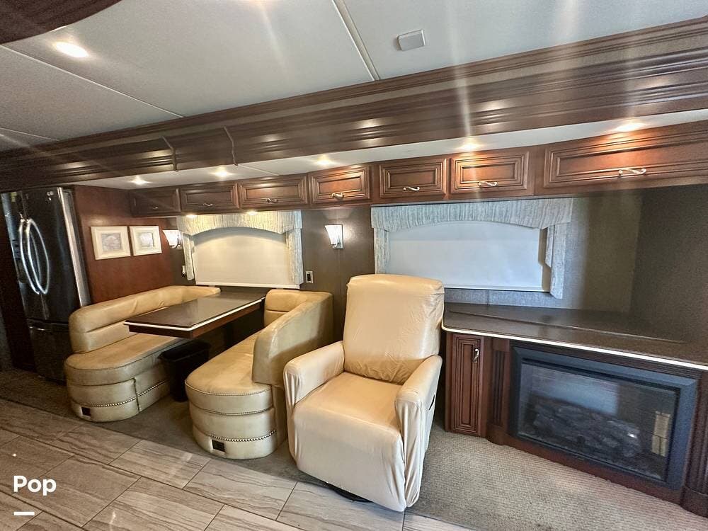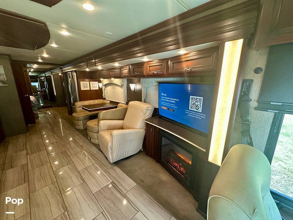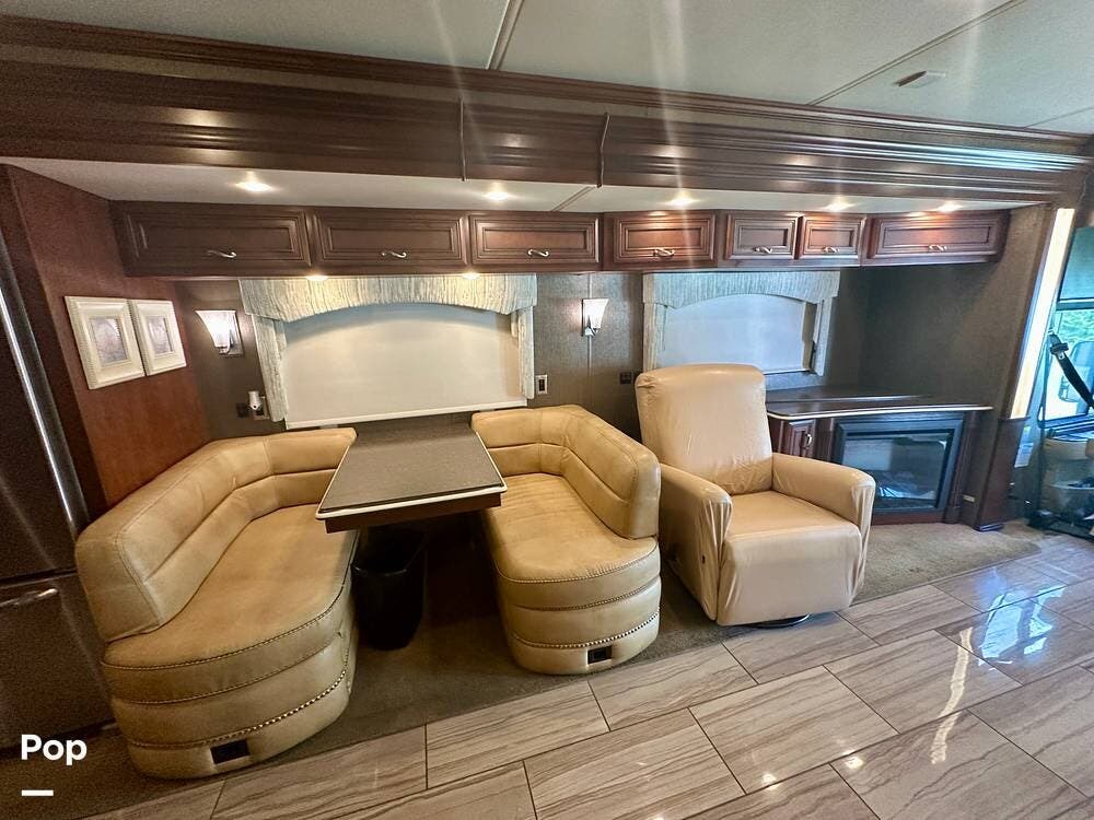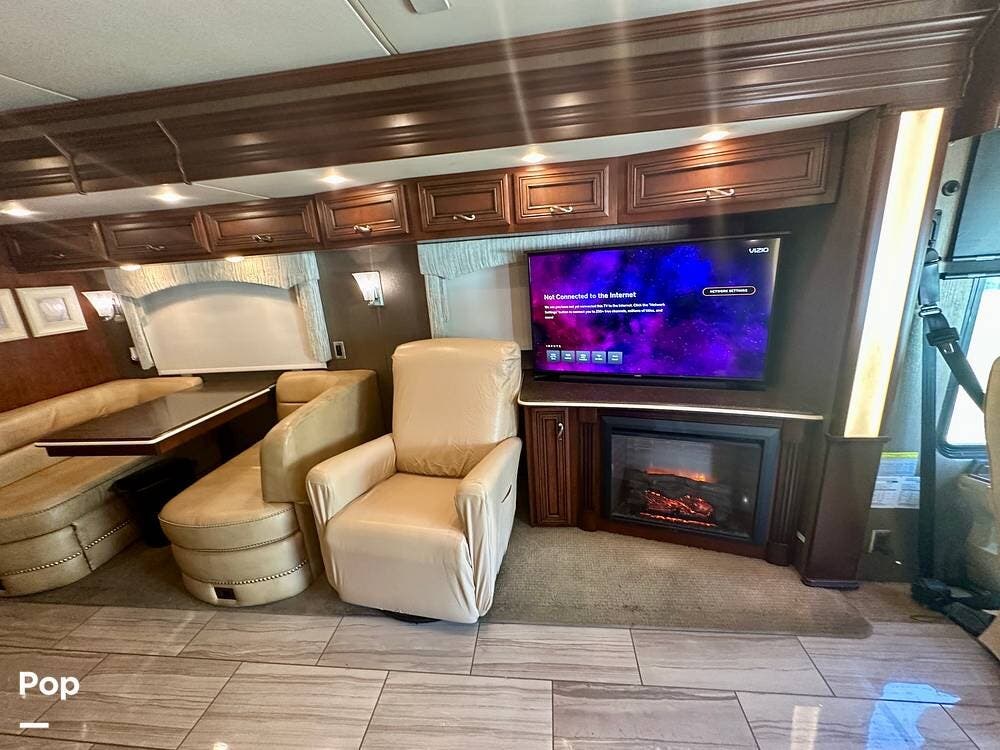 Inside, the craftsmanship Newmar is known for is immediately apparent. The living area feels residential and inviting, featuring upgraded theater seating, a professionally reupholstered reclining captain's chairs set, a booth dinette for four, and a fireplace with a televator and sound bar that anchors the space.