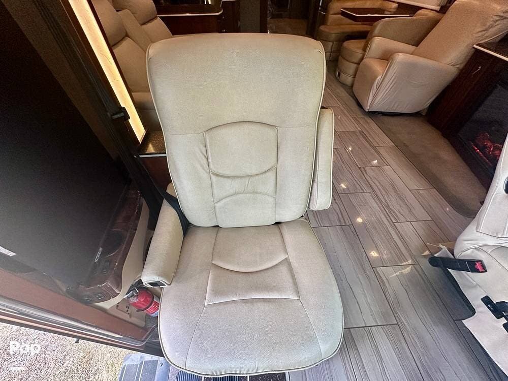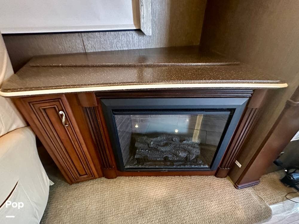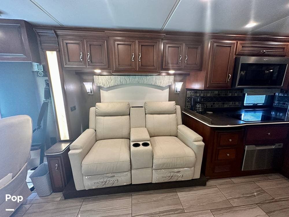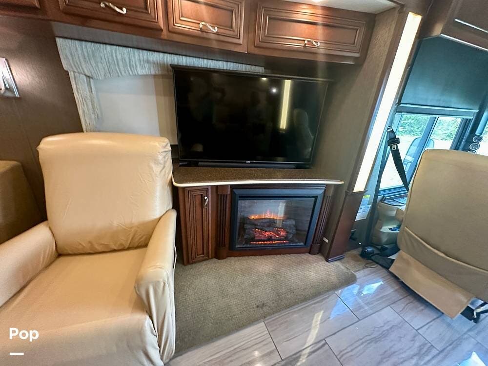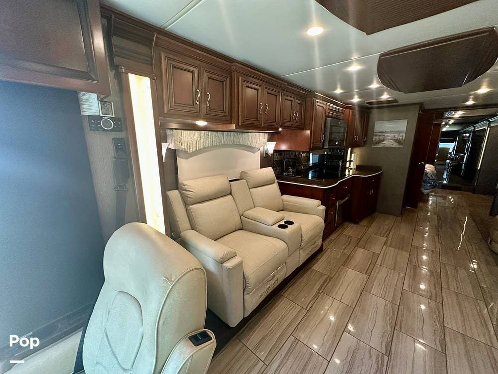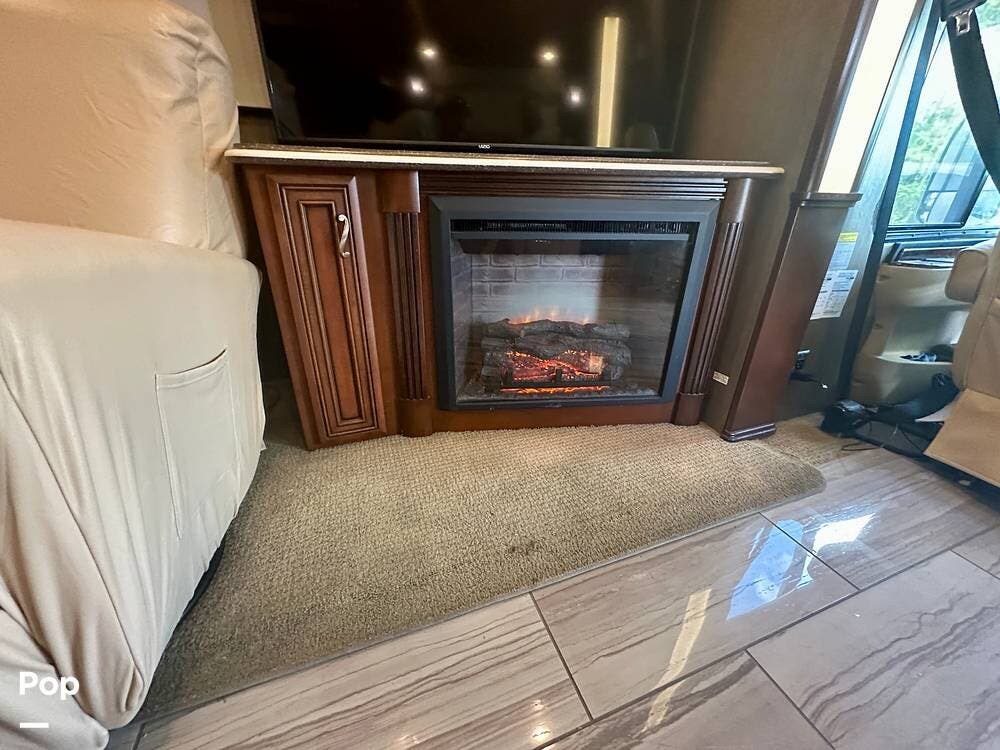 Inside, the craftsmanship Newmar is known for is immediately apparent. The living area feels residential and inviting, featuring upgraded theater seating, a professionally reupholstered reclining captain's chairs set, a booth dinette for four, and a fireplace with a televator and sound bar that anchors the space.
