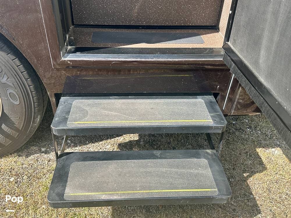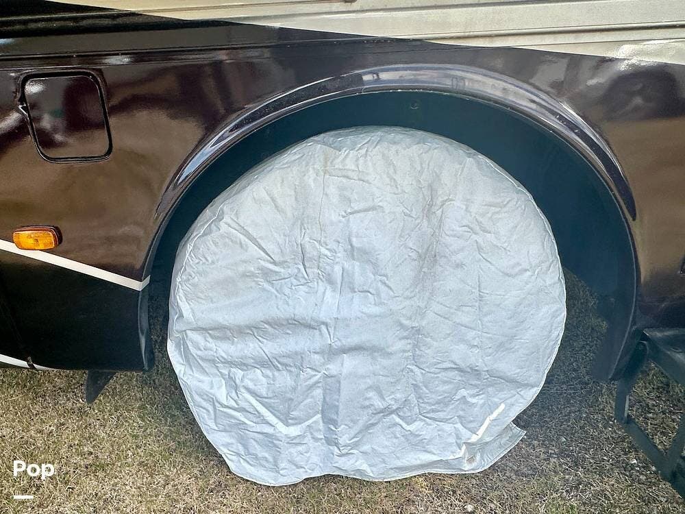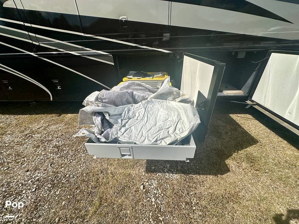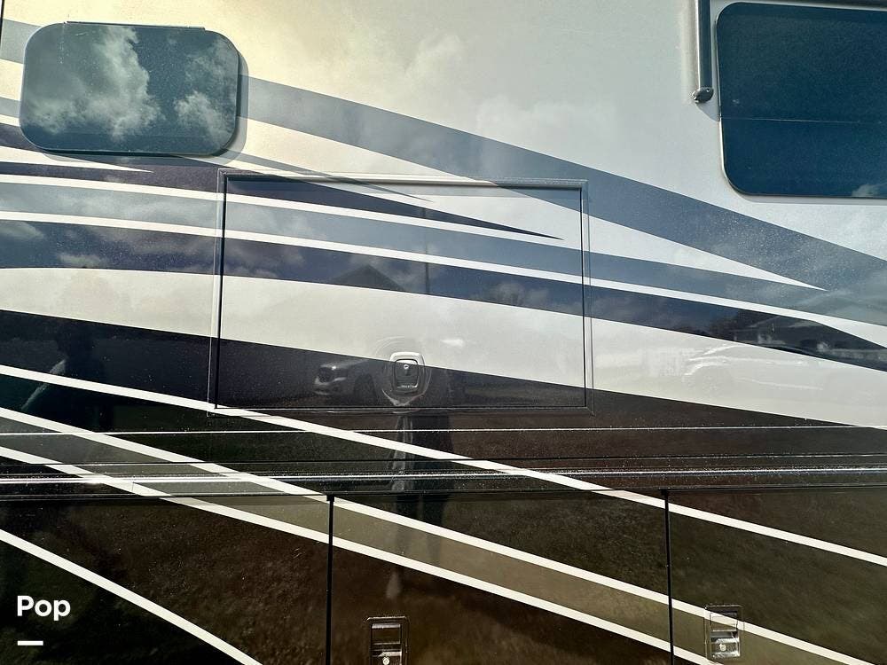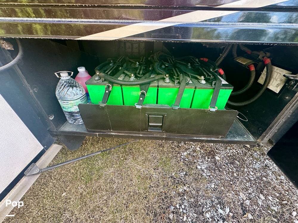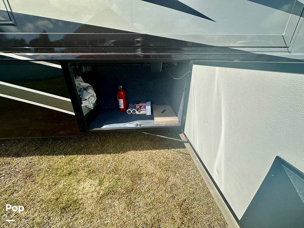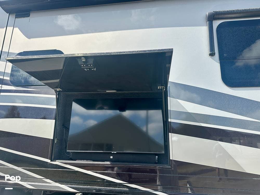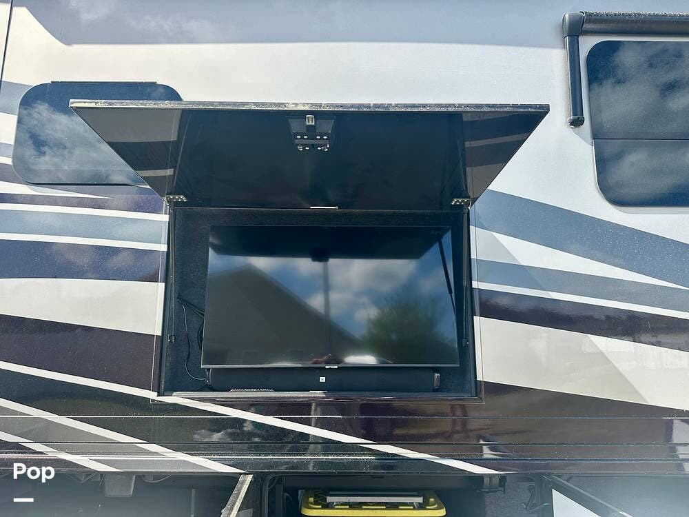 Outside, the experience continues with a power awning featuring wind-sensor protection and a removable sunshade, an exterior shower, a hitch, tire covers, and abundant basement storage. Snap Pads on the leveling jacks, a built-in surge guard power-protection system, a tire-monitoring system, and eight Toyo tires paired with eight Interstate house batteries reflect the care and investment put into this coach. Enjoy watching your favorite sports on the external TV.