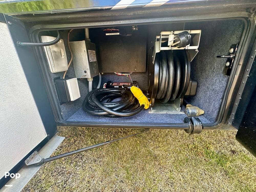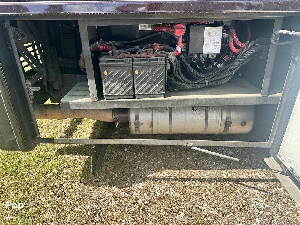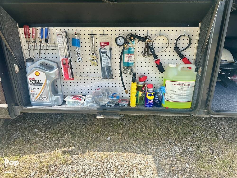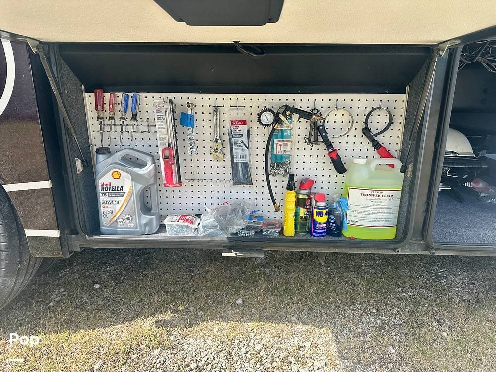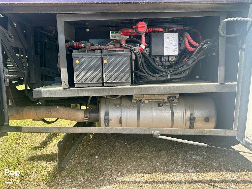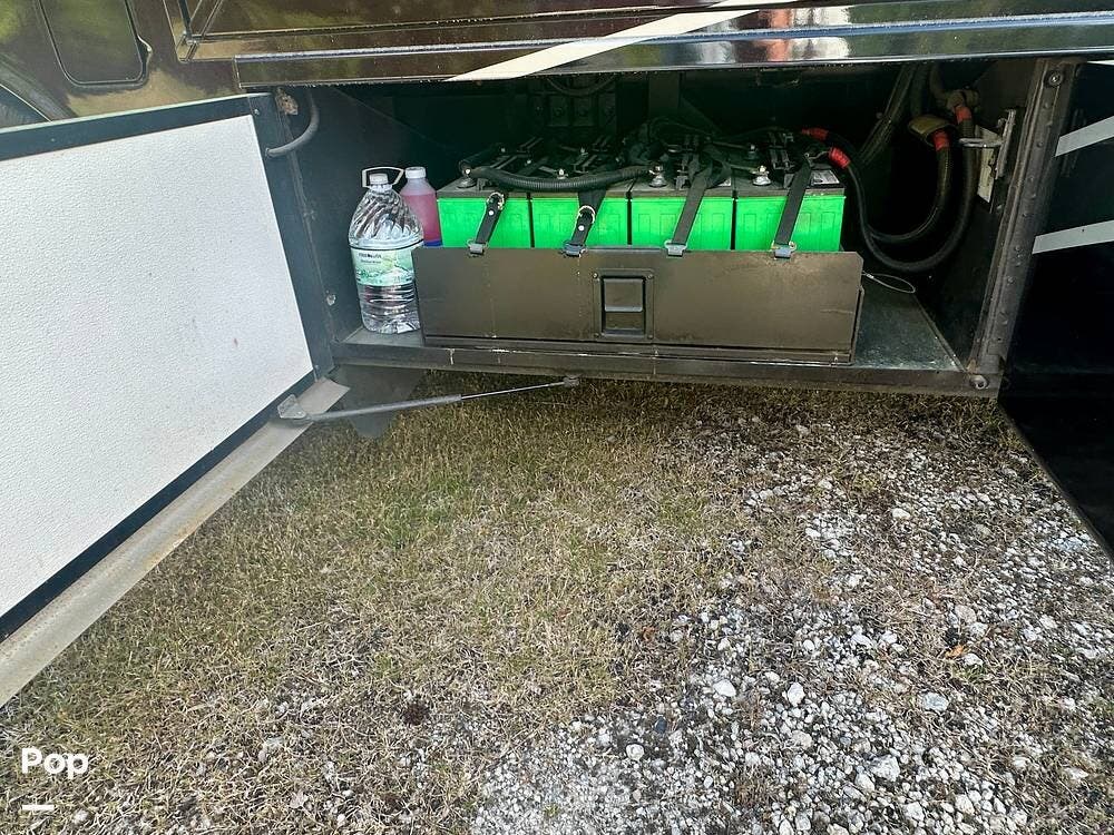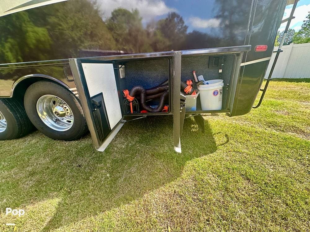 Outside, the experience continues with a power awning featuring wind-sensor protection and a removable sunshade, an exterior shower, a hitch, tire covers, and abundant basement storage. Snap Pads on the leveling jacks, a built-in surge guard power-protection system, a tire-monitoring system, and eight Toyo tires paired with eight Interstate house batteries reflect the care and investment put into this coach. Enjoy watching your favorite sports on the external TV.